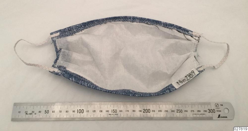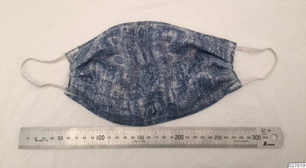 Skydd av två lager textil, det ena är blåmönstrat och det andra är i vit vliesofix. Tygbiten har plisserade kortsidor och två resårband är fästa på respektive sida.