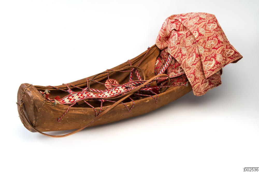 Gietkka. Vagga med alla tillbehör i form av band, bolster och täcke av renkalvskinn. Antal delar: 5 st.