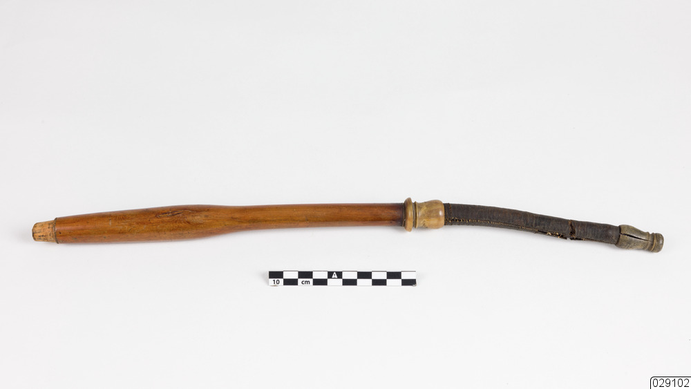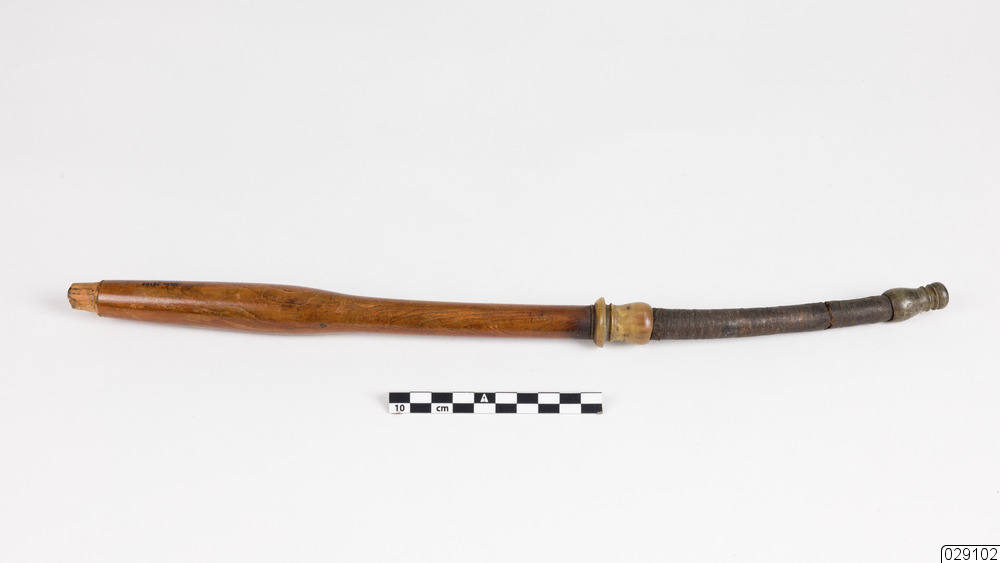 Brunbetsat pipskaft av trä med svart munstycke och hornbeslag. Skaftet är lätt böjt med en lätt ansvällning i trädelen.