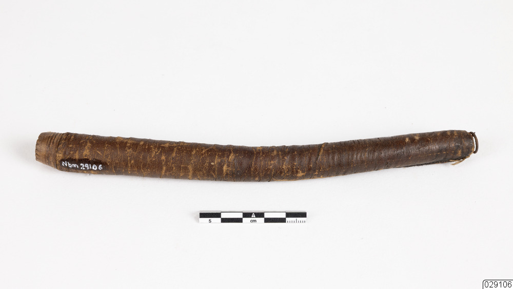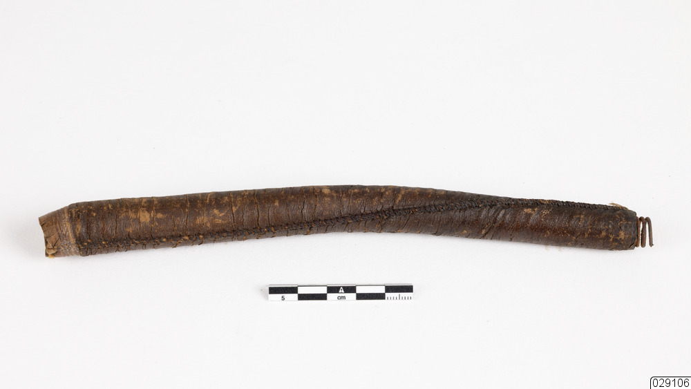 Mörkbrunt pipskaft utan munstycke. Skaftet består av en spiralrullad stålfjäder inuti en hoprullad kavel.