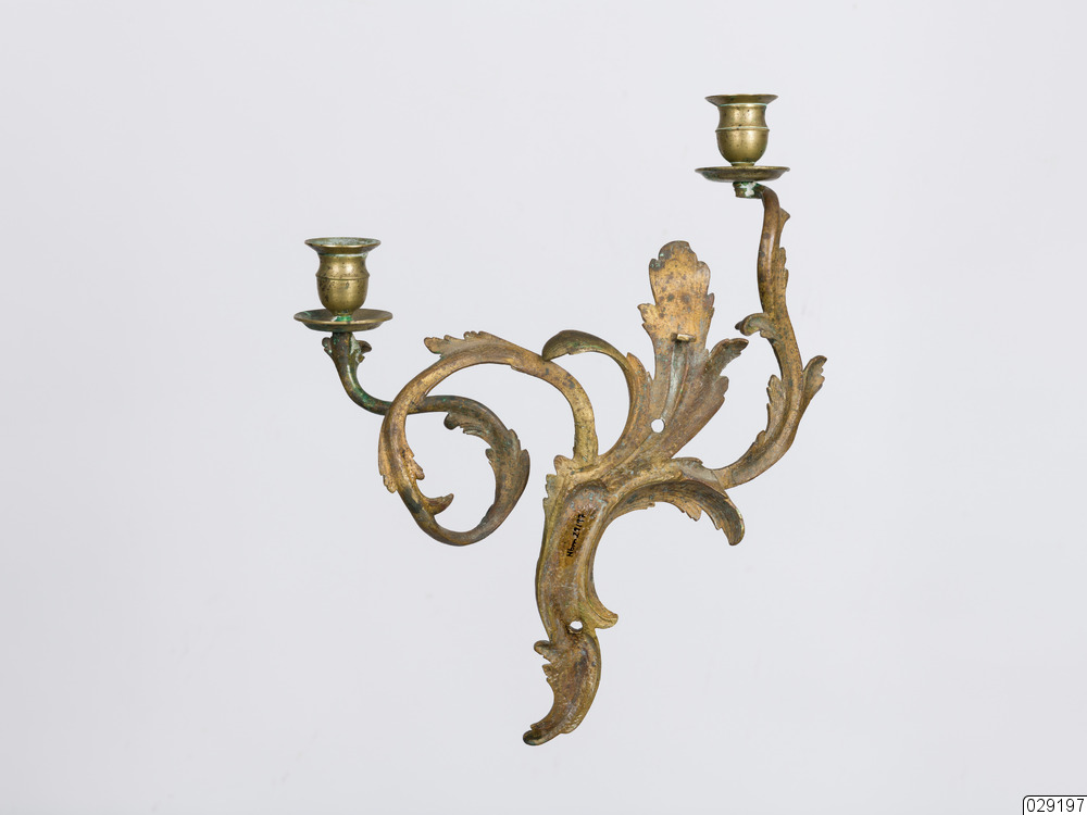 Lampett för två stearinljus. Huvudstammen utgörs av en svängd bladbukett med böljande slingor. Från buketten utgår två snirkliga ljusarmar med varsin ljushållare. Den ena går uppåt medan den andra går i en ögla. Lampetten är försedd med två hål för uppsättning på vägg.