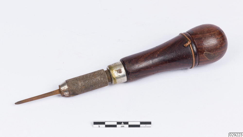 Prylen består av ett mörkbrunbetsat knopphandtag och ett greppräfflat chuckfäste. Knoppen kan skruvas bort från det ihåliga handtaget som innehåller tre prylspetsar av olika dimensioner; en skruvmejsel, ett stämjärn samt en getfot. Den fjärde spetsen sitter i chuckfästet. I metalldelen finns texten "TOOLSMITHS (...) MASS. U.S." instämplat.