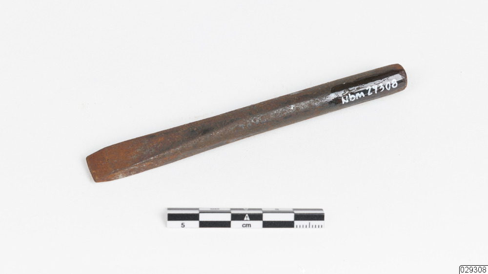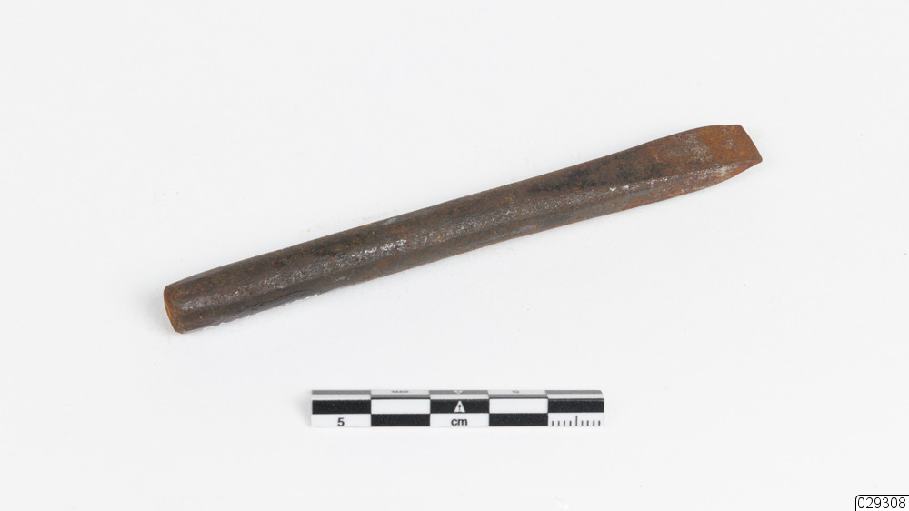 Huggjärnet består av en rund järnstång med en rak mejselegg i ena änden.