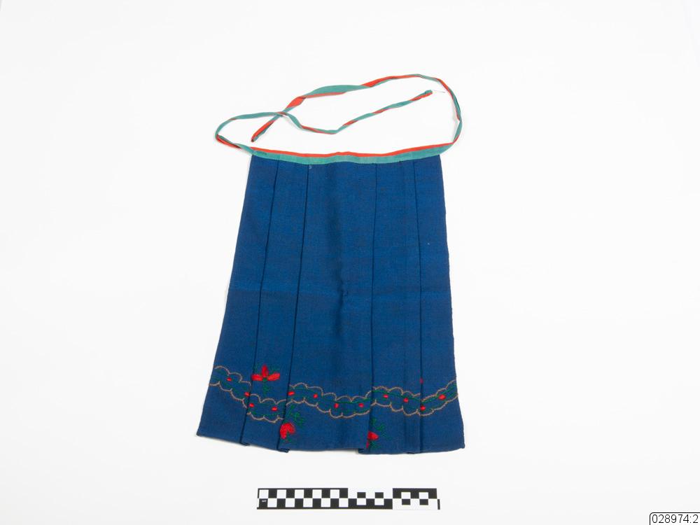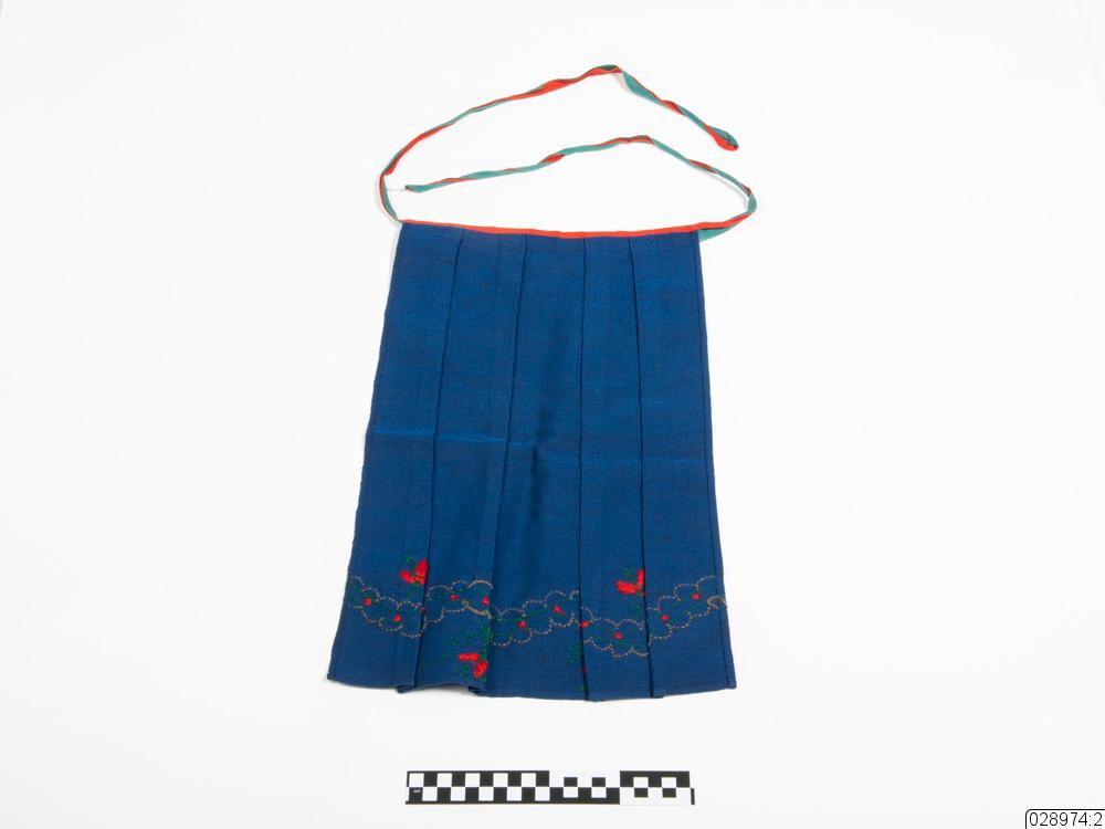 Förklädet är mörkblått med broderier som föreställer blommor och växtlighet. Förklädet är även veckat. Förklädet knyts ihop runt midjan med två band som är ihopsydda till ett.