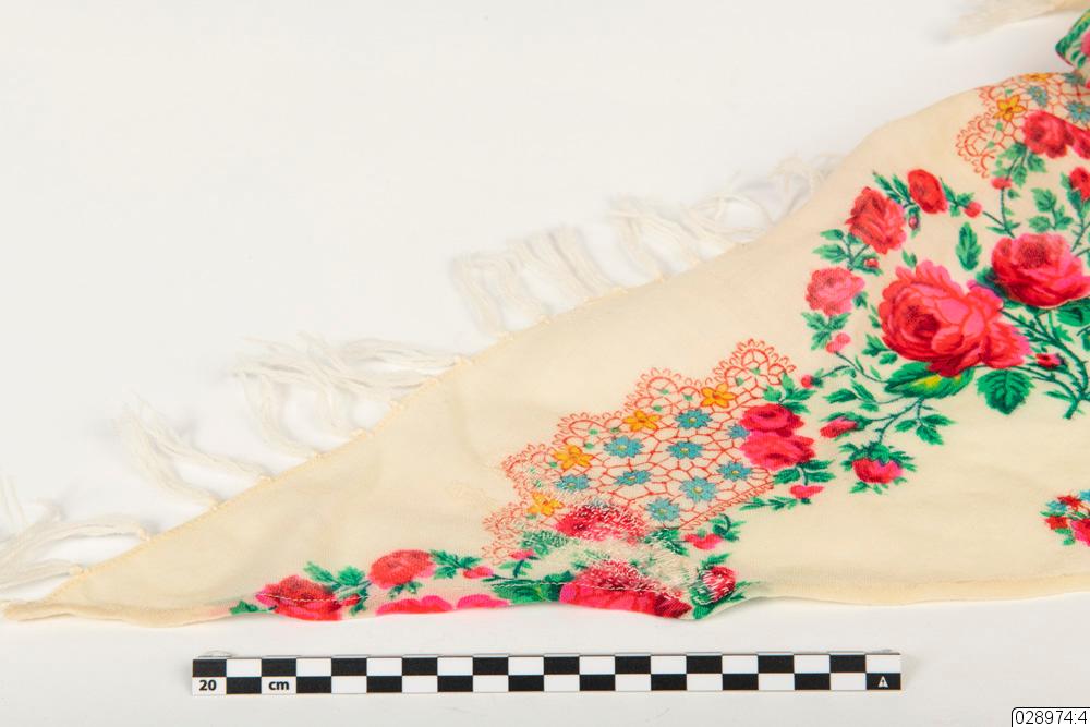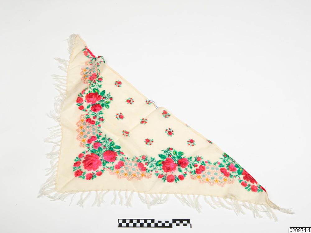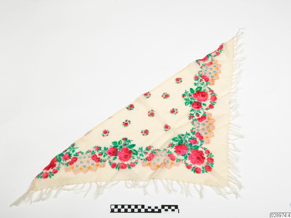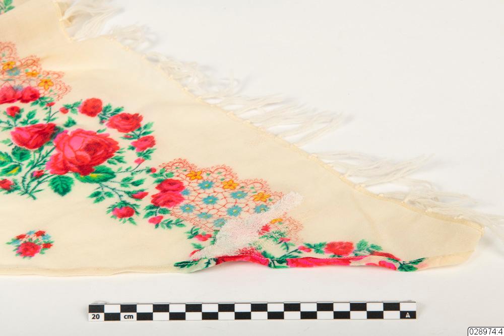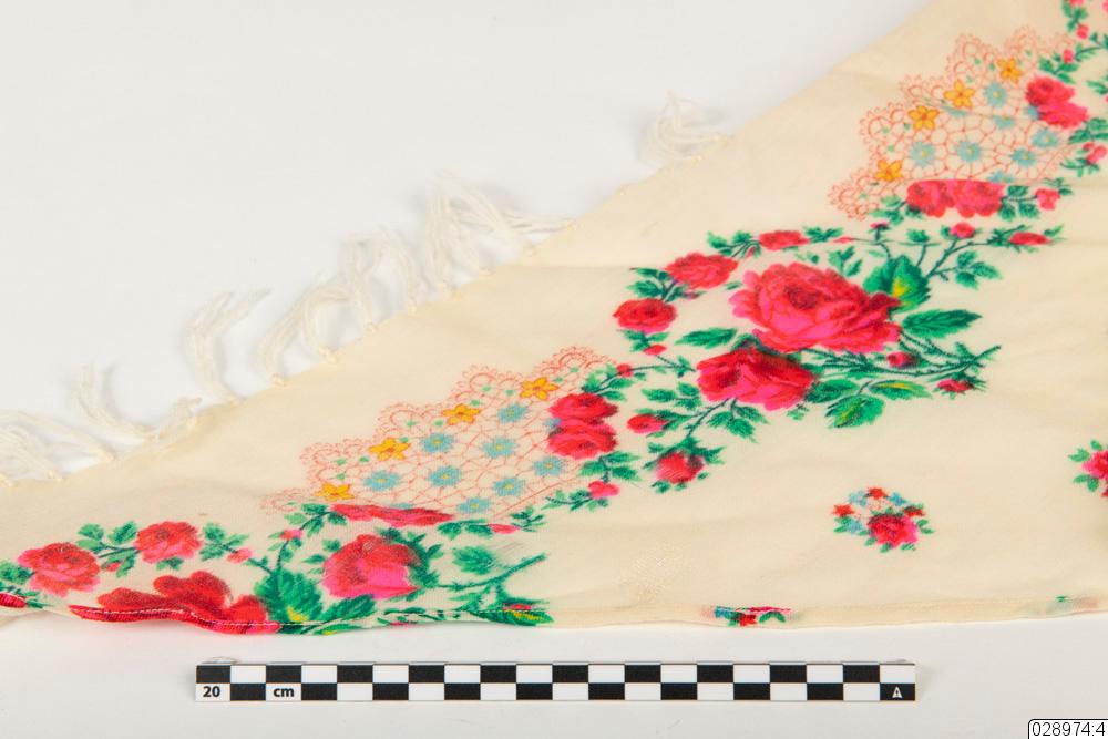 - Sjalen är vit med rosa rosor och gröna blad. Sjalen har även ett flertal blommor i färgerna blått och gult. Blommorna omges av ett rött mönster. I kanten på sjalen är det vita fransar.