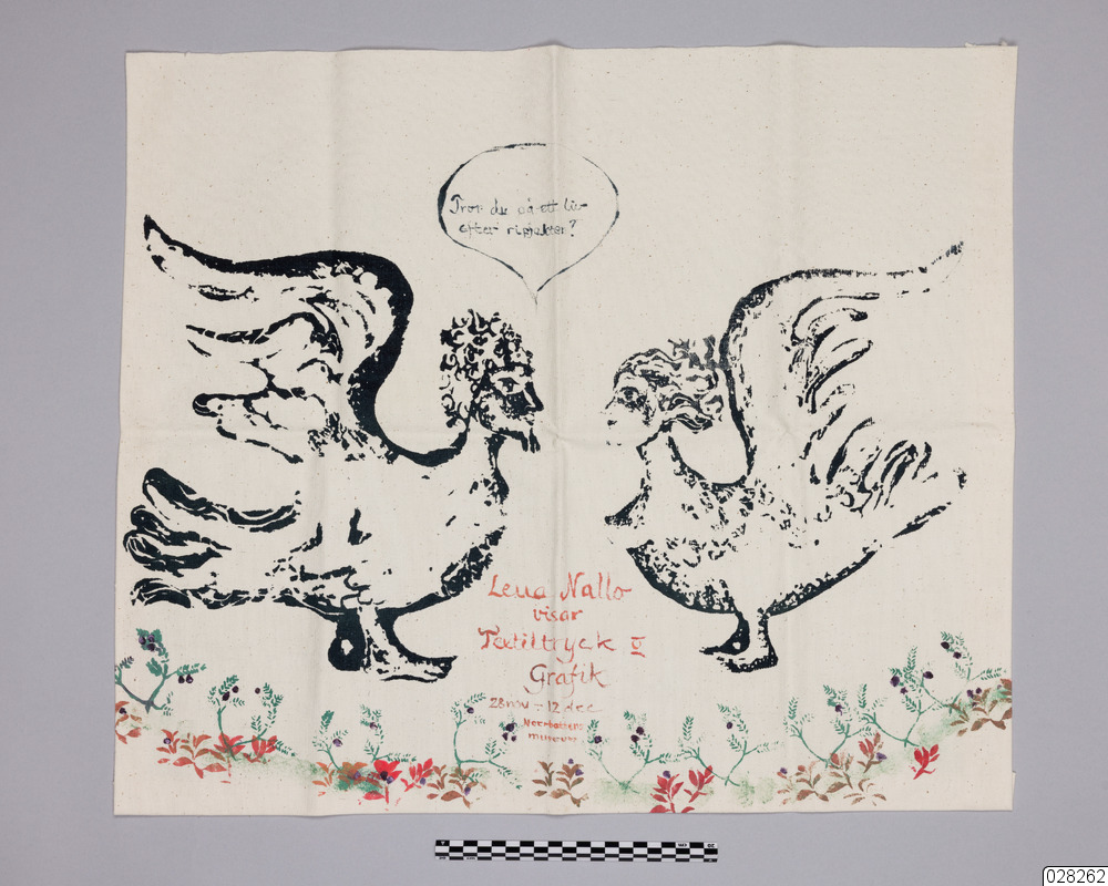 Textiltryck med motiv och information om tidpunkt för utställningen på Norrbottens museum. [Sammanhör med diarienummer 1997/74, 2055/75 och 0007/76 samt ärendenummer F10:103, 106. ]