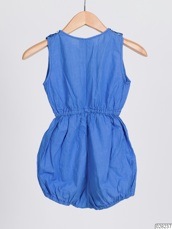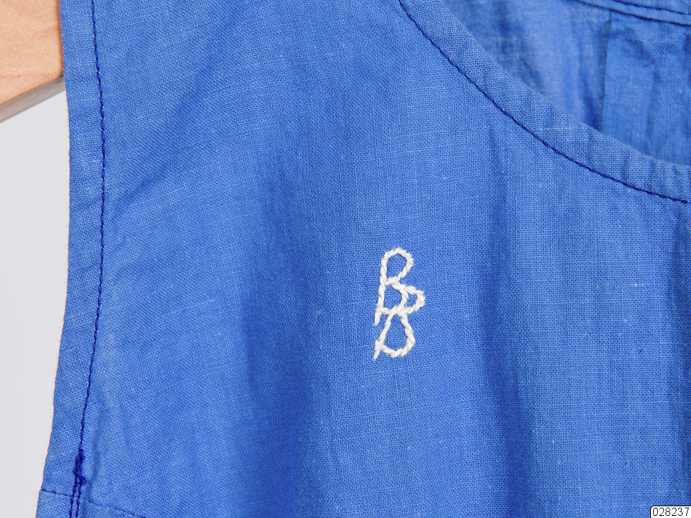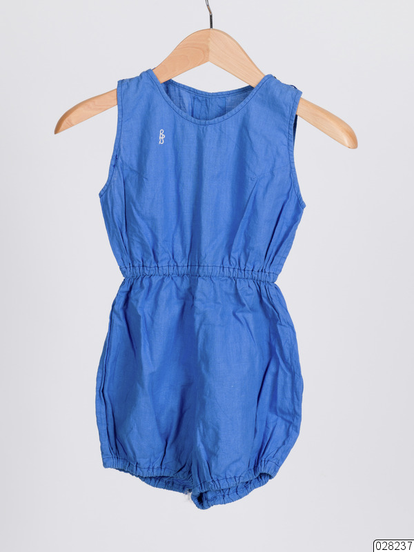 Blå gymnastikdräkt för ett barn i byxdräktsmodell utan ärm och korta ben. På axelbanden är knappar fästa. Resår i midja och i benslut. På högra bröstet är "BB" broderat i vitt.