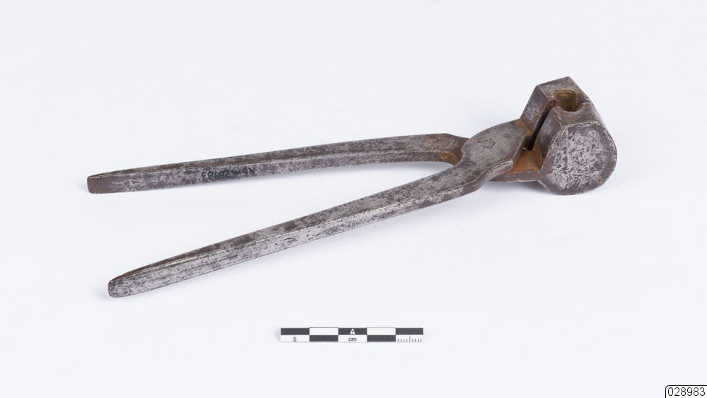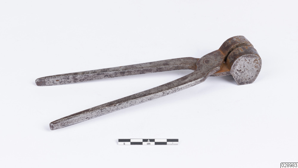 En stor kultång tillhörande en lodbössa, gjord i metall. Kultången har en urgröpning för att kunna producera egna kulor till lodbössan.