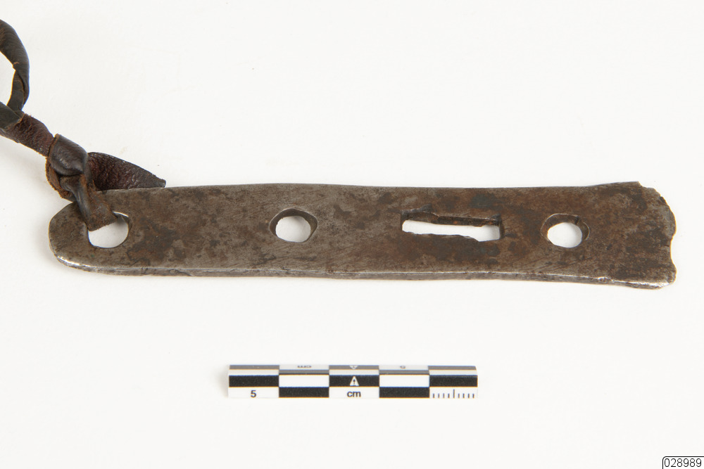 Ett verktyg till lodbössan. Verktyget är utformad i en rektangulär form med tre hål och ett avlångt hål. Den sitter fast i ett lädersnöre, som sitter fast i ett större knipe med flera verktyg till en lodbössa.