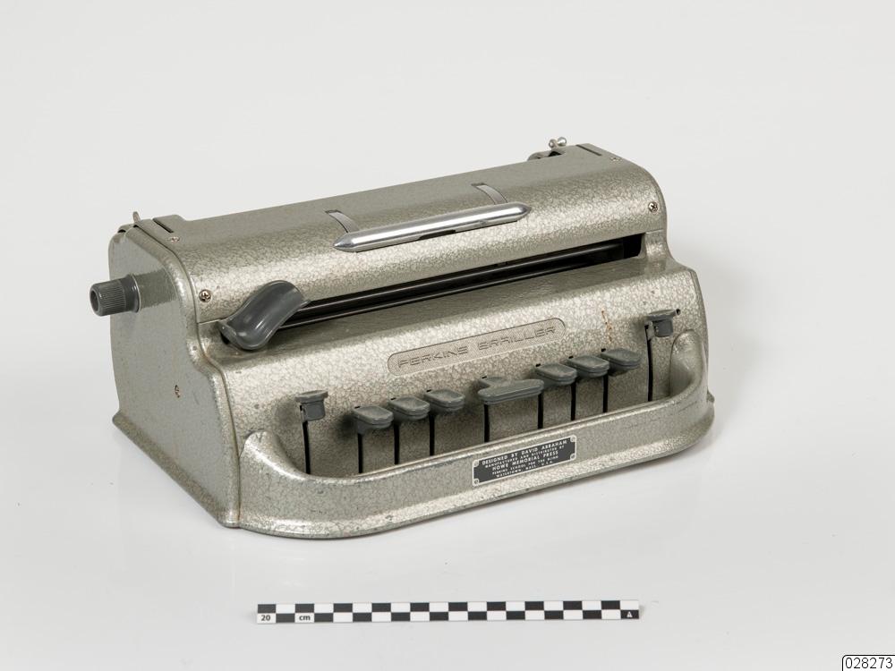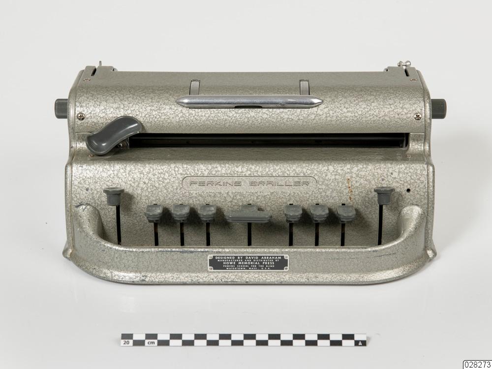 En bräckligt grå punktskriftsmaskin i metall, med grå tangenter i plast. På framsidan sitter nio tangenter. Mellanslagstangenten sitter i mitten. Det sitter tre tangenter på respektive sida om mellanslagstangenten som motsvarar punkterna i punktskriftsalfabetet. På höger sida om tangentraden sitter en backslagstangent och en linjeavståndsknapp. Ovanför tangentraden sitter en spak i grå plast som flyttar markeringen på pappret i maskinen. På båda sidorna av maskinen sitter rattar i grå plast som är till för att mata pappret. På ovansidan sitter två metallspakar som håller pappret på plats. På baksidan finns en metallrulle där pappret ska matas in samt fler reglage i metall. Ovanpå maskinen finns ett handtag i metall som går att fälla upp och ned. På maskinens undersidda sitter en pappskiva. På framsidanöver tangentraden är texten "PERKINS BRAILLER" ingraverad. Under tangentraden sitter en bricka i metall med texten "Designed by David Abraham", "Manufactured and distributed by Howe Memorial Press", "Perkins school for the blind Watertown, Mass., U.S.A".
