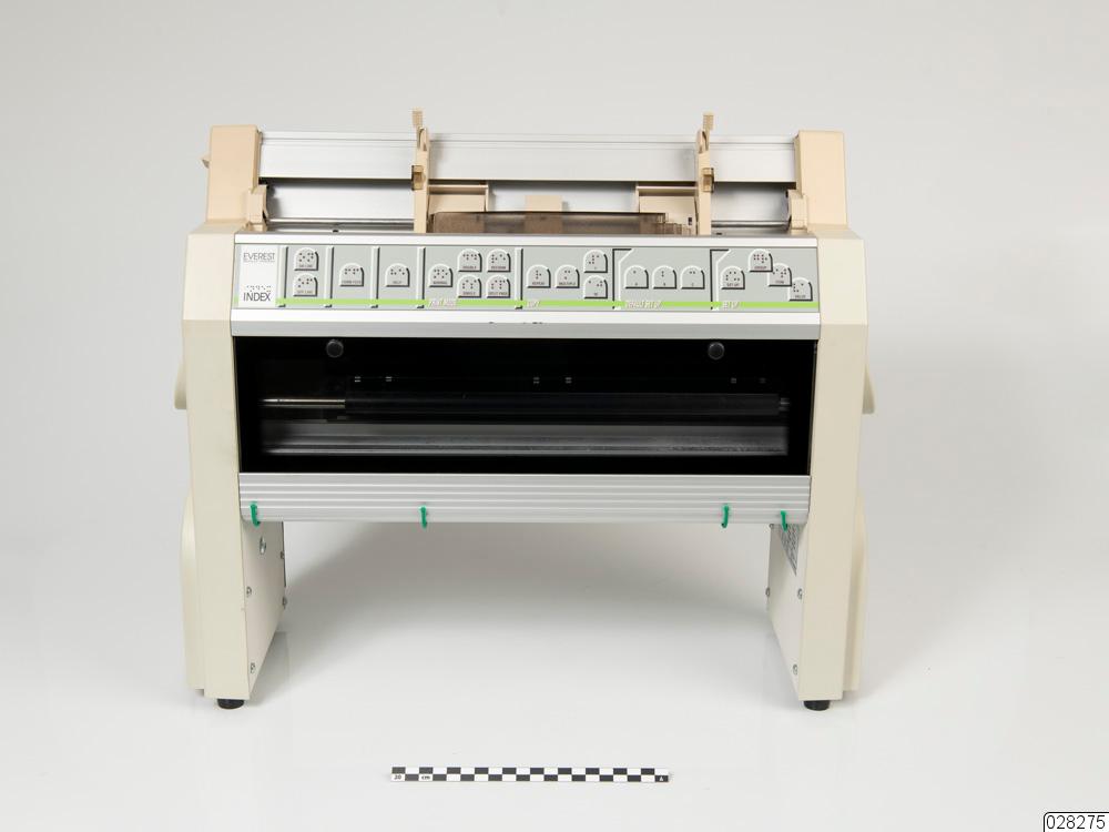 - En skrivare som kopplas till en dator med sladd för att skriva ut dokument i braille. Skrivaren står på två ben av beige plast. Benen vilar på fyra tassar i gummi. På framsidan finns en panel i grå plast med 20 knappar med både text och braille på. Knapparna är indelade i fyra kategorier "PRINT MODE", "COPY", "DEFAULT SET UP" samt "SET UP". Längst till vänster på displayen står det "EVEREST BRAILLE PRINTER", "INDEX" samt "index" i braille. Plastpanelen är fäst i en metallstruktur. Under panelen är en glasskiva som visar skrivarens insida. På undersidan sitter fyra gröna plastkrokar. På ovansidan sitter fyra metallrullar ihop med plastdelar där pappret ska matas in för utskrift.på baksidan finns en fläkt och två uttag; en VGA port och en centronic port. På högra benet sitter uttaget för strömkabeln. Ovanför sitter en grön av/på knapp. Över hela baksidan står information om skrivaren, såsom "printing speed", "dot size" och "braille tables". Där står även information om vilka val som kan göras genom "set up". Det finns även en varningstext "CAUTION! High voltages". I nedre vänsta hörnet står det "Made in Sweden by: INDEX BRAILLE PRINTER COMPANY".