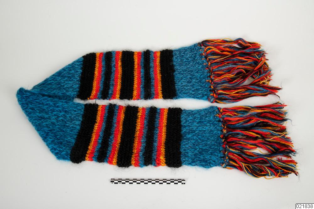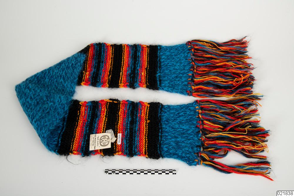 - En stickad halsduk i randigt mönster. Den är patentstickad med stora nålar. Det mesta av halsduken är i ett blåmelerat garn, ljusblått och mörkblått blandat. Mitten och ändarna av halsduken har denna färg. Däremellan är ett randigt part stickat med mindre nålar med svarta, gul-orange, röda och blå ränder. De svarta ränderna är rätstickade. I ändarna sitter en fransrad med 12 knutna tofsar i alla färger som finns i halsduken. På avigsidan sitter en tyglapp med texten "maj wennberg design kiruna sweden". Fäst med en tråd i lappen sitter en lapp i papp. Ena sidan har ett fotografi som föreställer en kvinna klädd i vinterkläder framför ett snötäckt fjäll. På andra sidan av lappen står information om halsduken "BLÅ JOJKU", "mod: HALSDUK MED FRANS", "18X120X20", "Halsduk 150:-".