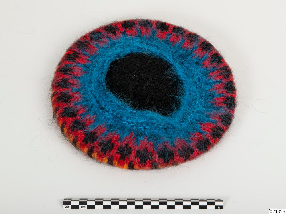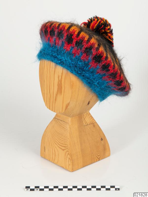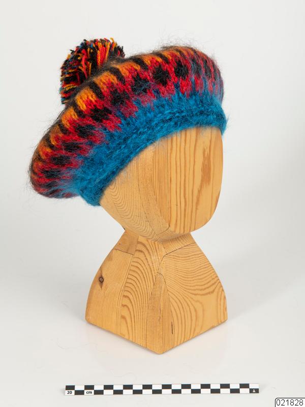 En slätstickad basker med tofs. Baskern har en dubbelstickad resårkant i en klar blå färg. Den blå färger övergår till ett rosa mönster med svarta prickar. Det rosa övergår till ett gult mönster som sträcker sig ut över baskerns hätta som är svart. Mitt på sitter en rund tofs med alla färger som finns i baskern. På insidan sitter en tyglapp med texten "maj wennberg design kiruna sweden". Fäst med en tråd i lappen sitter en lapp i papp. Ena sidan har ett fotografi som föreställer en kvinna i vinterkläder framför ett snötäckt fjäll. På andra sidan av lappen står information om mössan "namn: BLÅ JOJKU", "modell: TOFSBASKER", "storlek: M", "PROV".