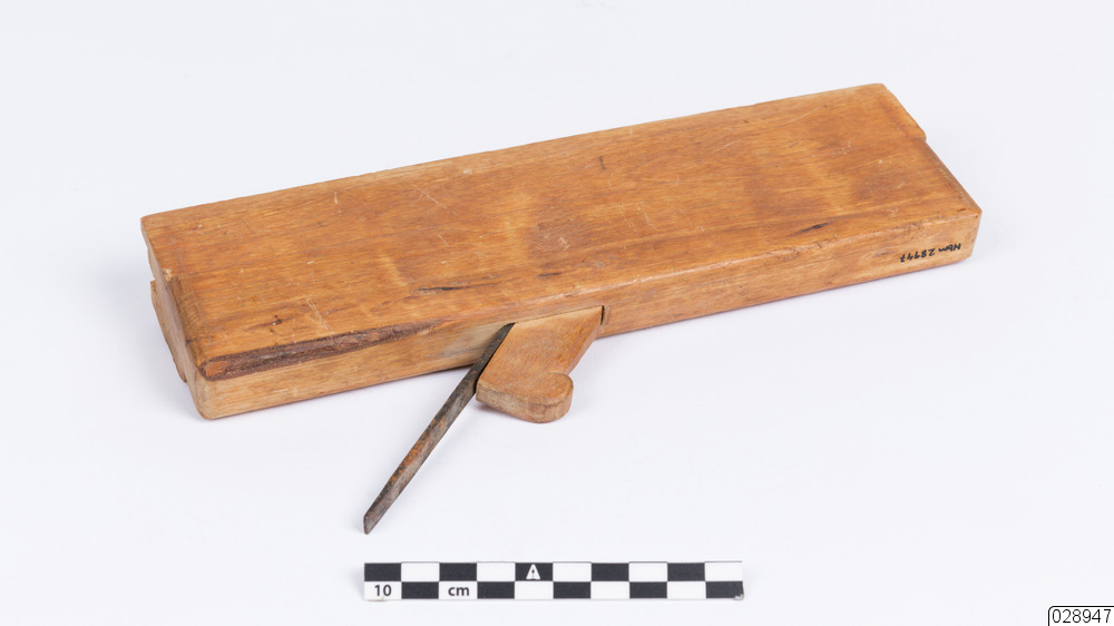 - En listhyvel som har använts vid tillverkning av begravningskistor. Hyveln är av trä med ett stämjärn som kan regleras med hjälp av en träkloss. På undersidan finns det en djup skåra och i stämjärnet så finns det träflisor kvar.
