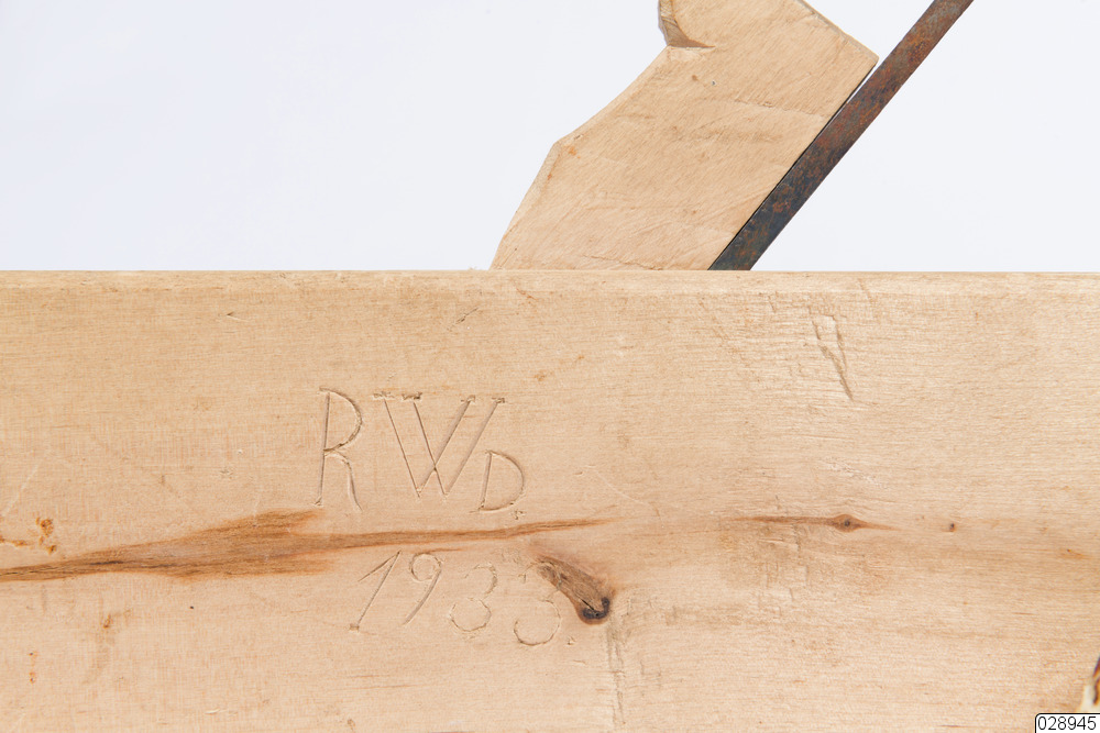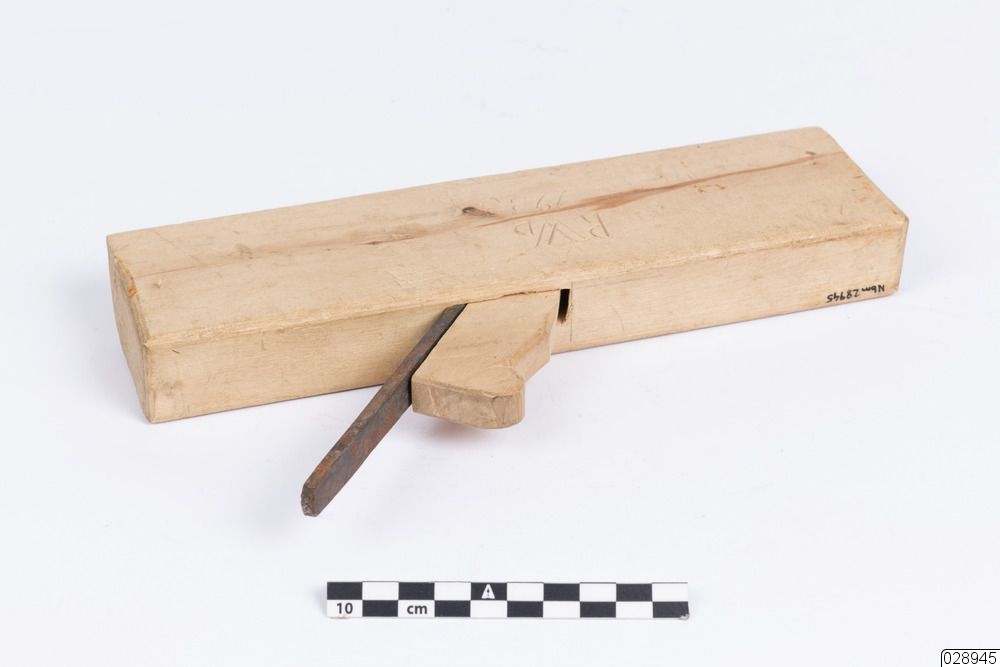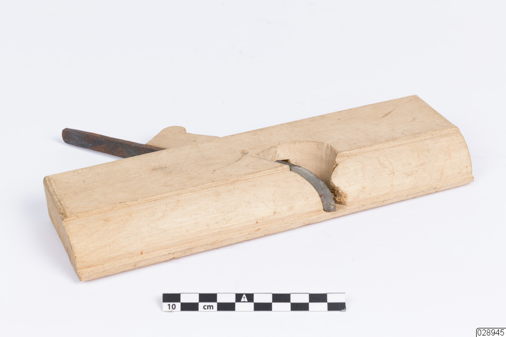 En listhyvel som har använts vid tillverkning av begravningskistor. Hyveln är av trä med ett stämjärn som kan regleras med hjälp av en träkloss. Inristat på hyveln står det "R W d 1933".