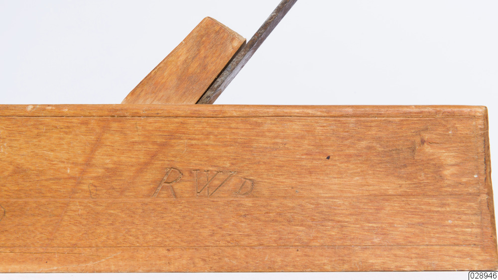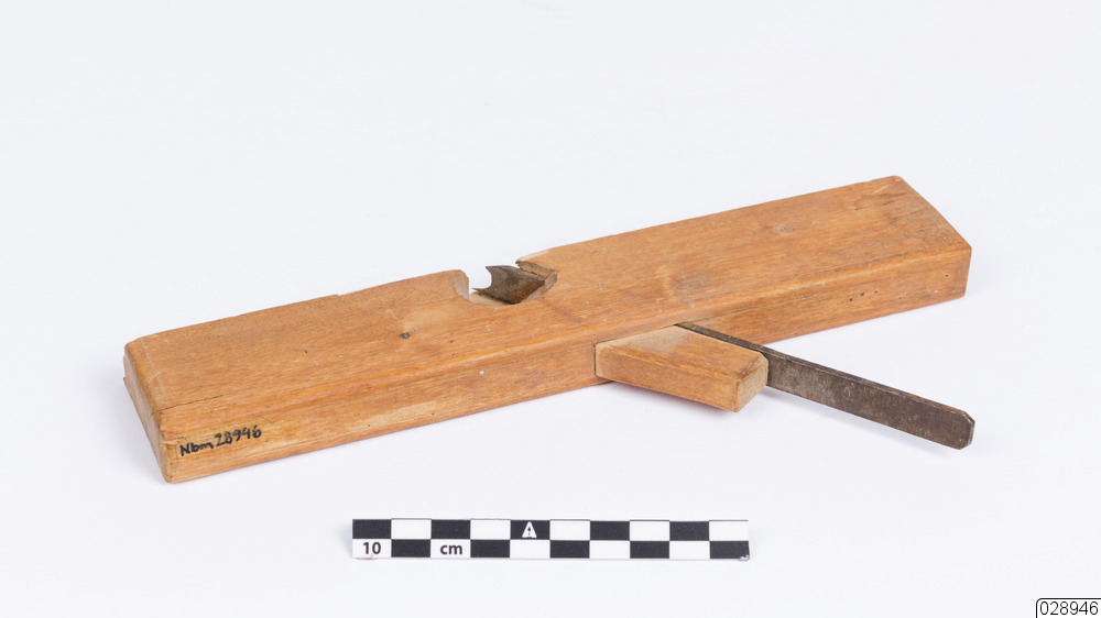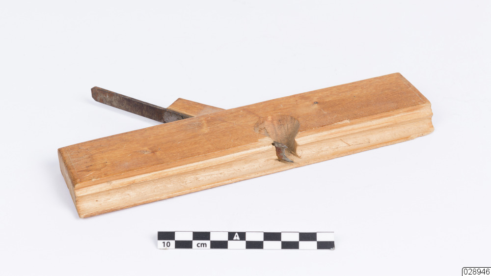 En listhyvel som har använts vid tillverkning av begravningskistor. Hyveln är av trä med ett stämjärn som kan regleras med hjälp av en träkloss. Inristat på hyveln står det "R W d".