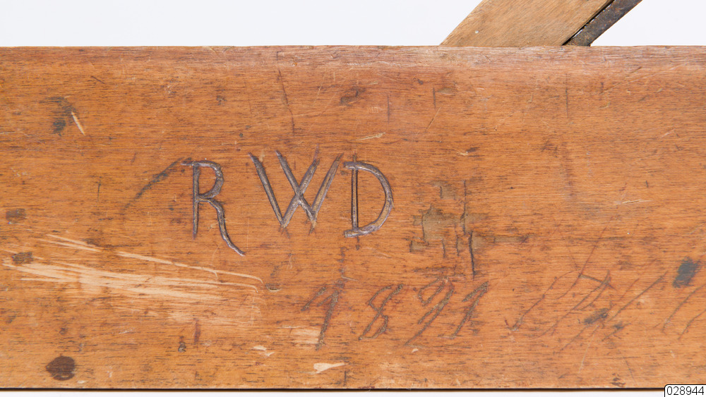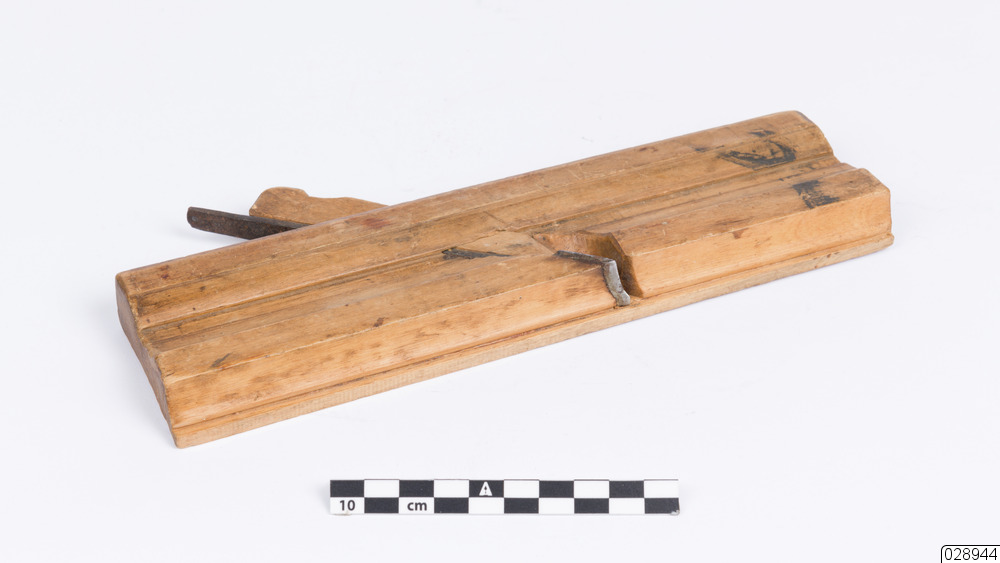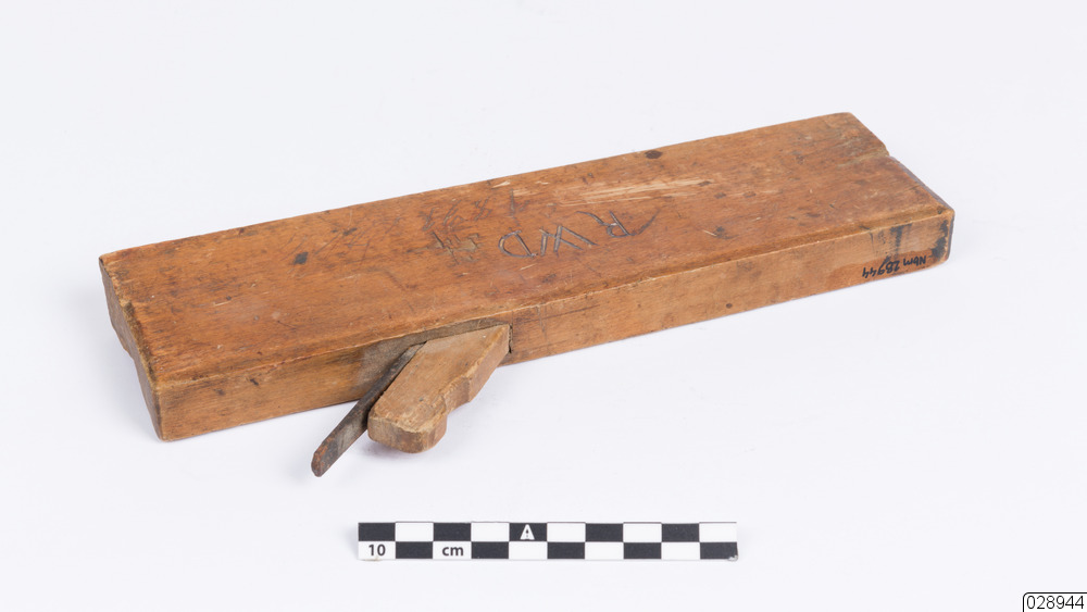 En listhyvel som har använts vid tillverkning av begravningskistor. Hyveln är av trä med ett stämjärn som kan regleras med hjälp av en träkloss. Inristat på hyveln står det "R W d".