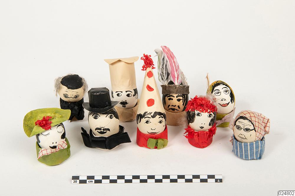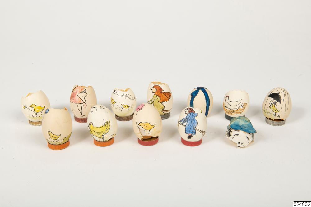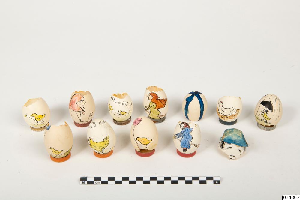 - Målade påskägg förvarade i en kartong (Nbm 24803). Åtta av äggen är hela och är målade med ansikten. De är placerade i var sin cirkel av papper. Pappret är klätt i olika tyger som ska se ut som kläder. Äggen har även hattar eller andra huvudbonader i tyg eller silkespapper. Resten av äggen är trasiga. Vissa är ägg med ansikten som gått sönder. De andra är ägg där botten tagits bort för att äggen sedan skall placeras i en liten metallfot. Dessa ägg har olika målade motiv med påsktema. På vissa ägg står det "Glad Påsk".