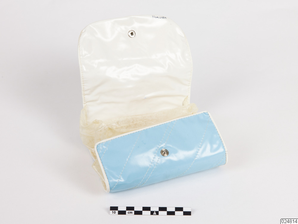 Ett reseetui för strumpor i blå och vit mjuk plast. Fodralet är ljusblått på utsidan och vitt på insidan. På utsidan står det text skrivet med blå tuschpenna "Enklare nylonstrumpor". Texten är suddig och blekt. Fodralet öppnas och stängs med en vit tryckknapp. På insidan finns fem plastfickor för strumpor. Plastfickorna har ett mönster som ser ut som vit spets.