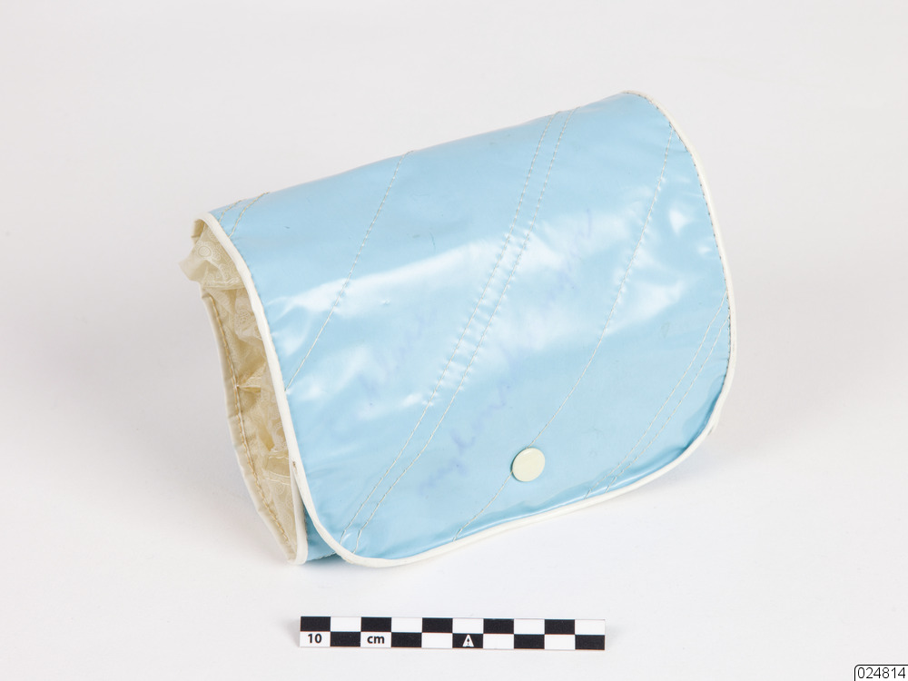 - Ett reseetui för strumpor i blå och vit mjuk plast. Fodralet är ljusblått på utsidan och vitt på insidan. På utsidan står det text skrivet med blå tuschpenna "Enklare nylonstrumpor". Texten är suddig och blekt. Fodralet öppnas och stängs med en vit tryckknapp. På insidan finns fem plastfickor för strumpor. Plastfickorna har ett mönster som ser ut som vit spets.