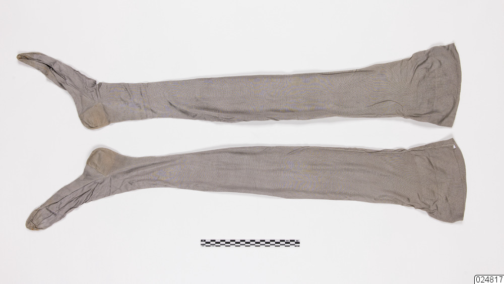 Ett par gråa nylonstrumpor som går upp till låret. Strumporna har en söm baktill längs hela benet. Foten har ett tjockare nylontyg på undersidan och över tån. Strumpan har en mudd av tjockare nylon högst upp.