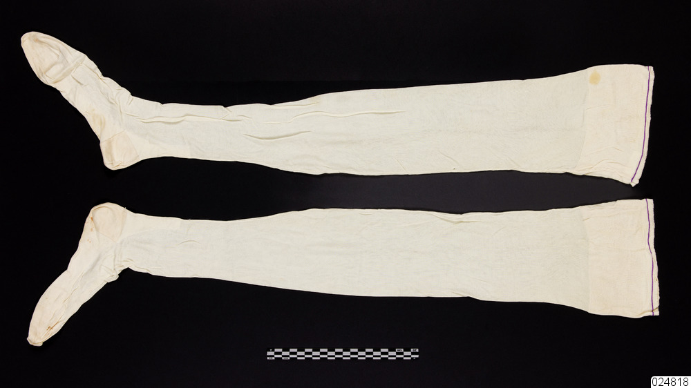- Ett par vita nylonstrumpor som går upp till låret. Strumporna har en söm baktill längs hela benet. Foten har ett tjockare nylontyg på undersidan och över tån. Strumpan har en mudd av tjockare nylon högst upp. Vid kanten går en lila rand runt mudden.
