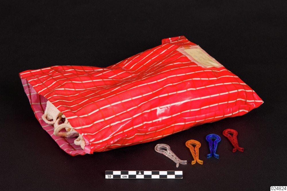 - En orange plastpåse med vita ränder. Påsen har inga handtag. Den har en liten plastficka för en etikett. På etiketten står det skrivet i blyerts "Stickade o. virkade dambindor". Påsen har två sömmar längs sidorna. Påsen har förslutits med fyra plastklämmor. En röd, en blå, en gul och en vit.