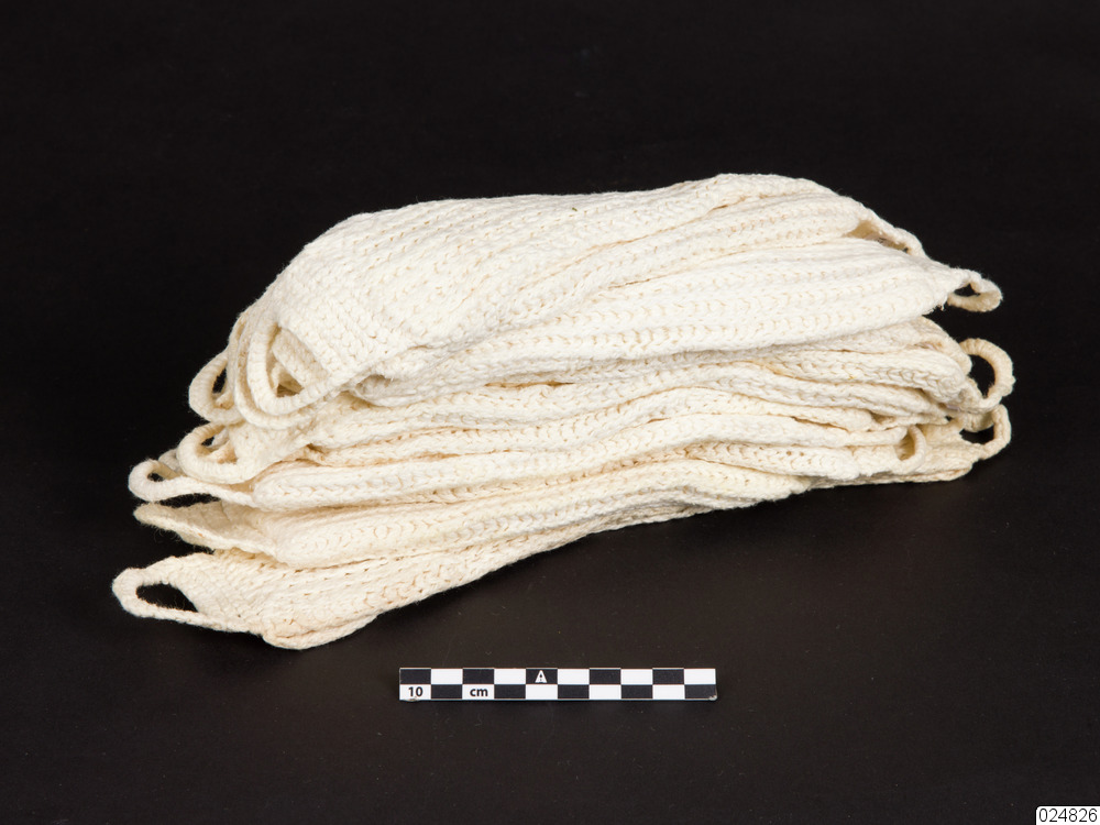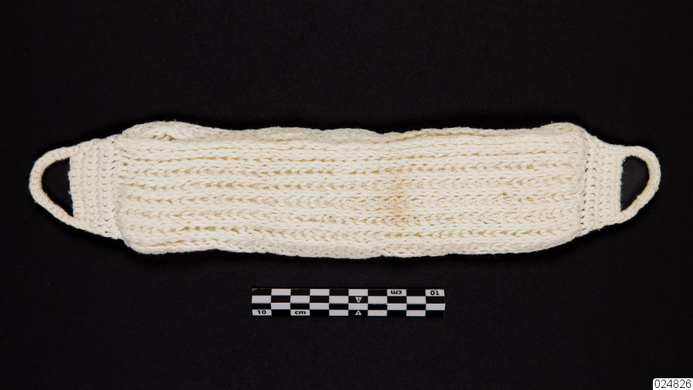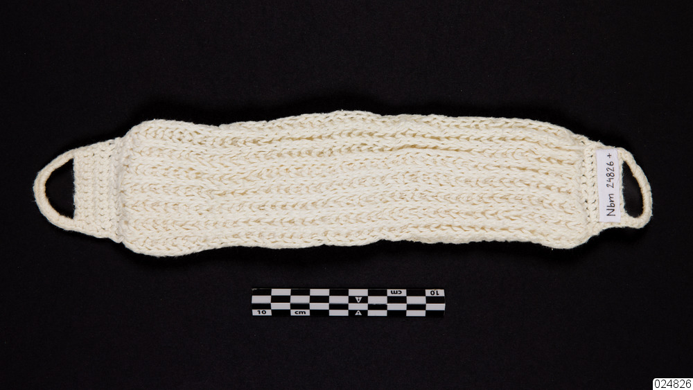 Elva stickade dambindor. Ribbstickad rektangulär dambinda. Bindan är vikt omlottoch sedan fäst i ändarna. I båda ändarna finns två stickade öglor.
