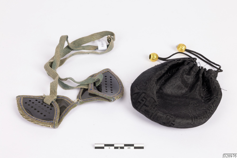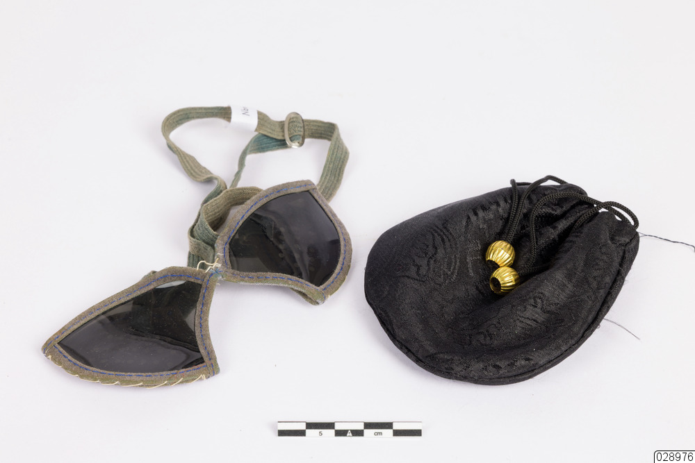 Ett par solglasögon. Solglasögonen är triangelformade med mörkt plast som skyddar från solens strålar. På sidan av glasögonen finns det små ovala plastbitar med hål i för att skydda ögonen från solstrålar som kommer från sidan. Glasögonen fästs med hjälp av ett resårband som går att justera. Solglasögonen förvaras i en svart påse gjort utav silke med guldkulor. Påsen är lätt vadderad för att skydda glasögonen.