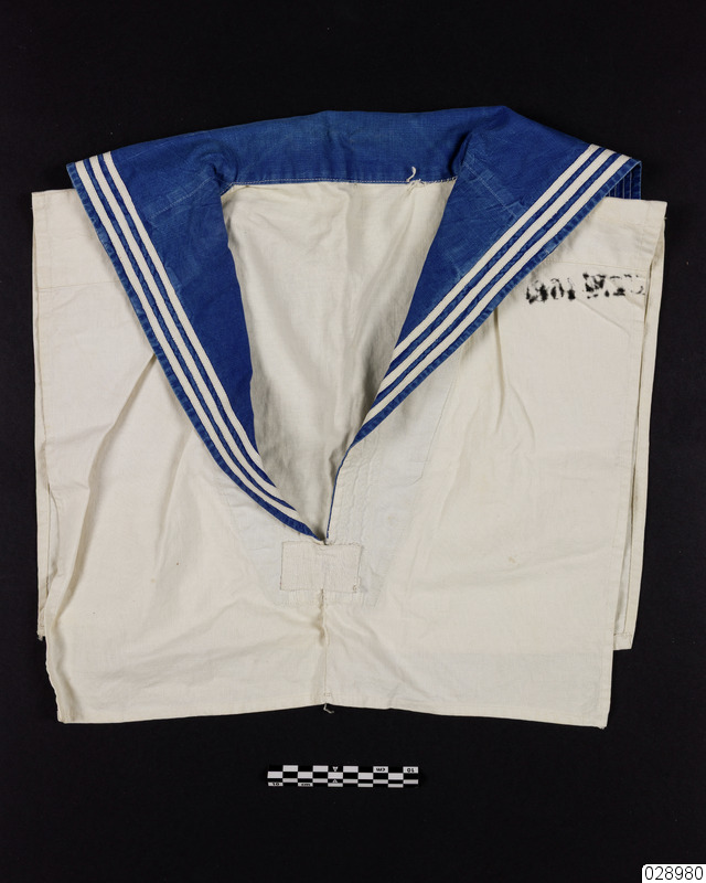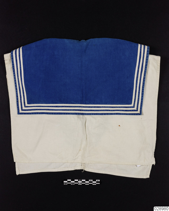 - En sjömanskrage som används accessor till sjömanskostymen. Den är maskinsydd i raksöm. Kragen har en blå rektangulär del som går ner över ryggen och avslutas som ett V framme i bröstet. På den högra sidan av kragen står det några siffror i bläck men det är svårt att se vad det ska stå då den verkar vara välanvänd.