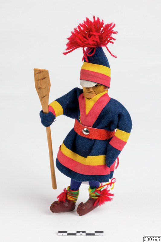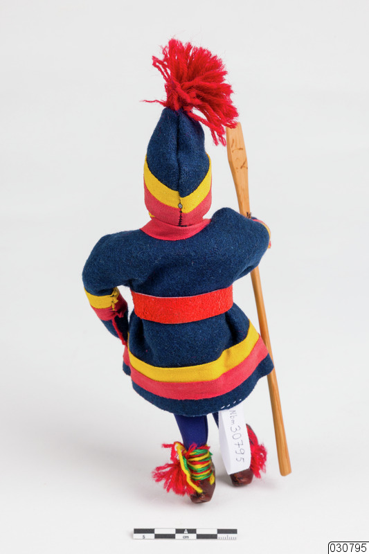 - En docka med nordsamisk kolt. På huvudet har dockan en mössa i färgerna mörkblått, gult och rött med en liten skärm framtill. På mössan sitter det även en stor garntofs. Ansiktet på dockan är tillverkat i trä. Överdelen på kolten är gjord i mörkblå filt med gula och röda band som fästs med en silvernit. På benen har dockan mörkblå byxor och på fötterna sitter det ett par skinskor med gul,gröna och röda garnband. I den ena handen så bär dockan på en skovelstav, en stav som används för att skotta bort snö i syfte att bedöma lavtillgången.