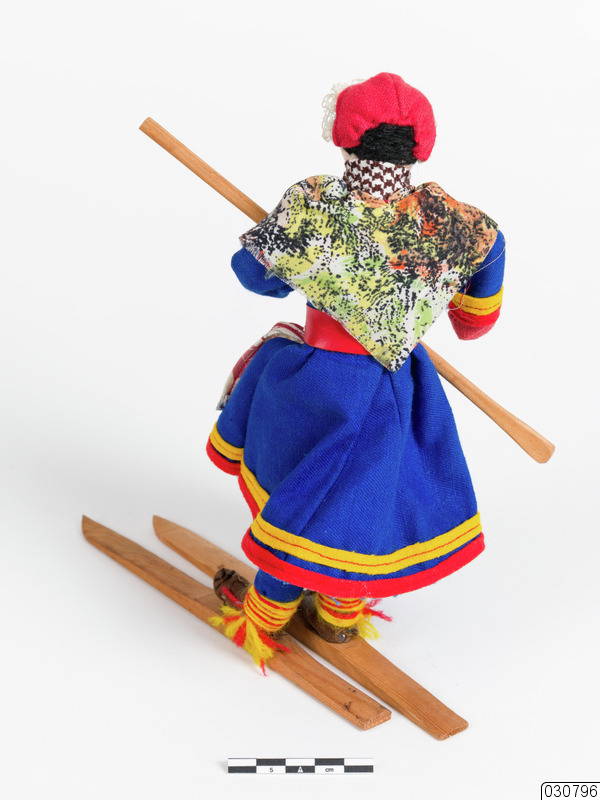 Dockan har en kvinnlig nordsamisk kolt. På huvudet har dockan en röd bindmössa, mörkt hår av garn och hennes ansikte är ritat i tusch. Runt halsen har hon ett brunt-och vitt tygstycke. Runt axlarna har hon en flerfärgad sjal. Själva kolten i sig räcker till vaderna och är av något grövre tyg. Kolten är i färgen mörkblå, med röda och gula inslag. Vid midjan har dockan ett rött läderbälte och i handen håller hon en skidstav. På fötterna har dockan skinnskor och träskidor.