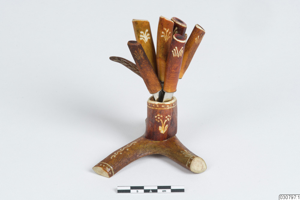 Ett knivställ i horn. Knivstället står på tre ben som en slangbella. Sedan har det två utstickande delar, en bit som även den ser ut som en slangbella. Den delen är dekorerad med ett graverat mönster. Sedan är den andra delen urholkat för att kunna ställa knivarna i. På den delen finns det graverat ett mönster som föreställer en blomma.