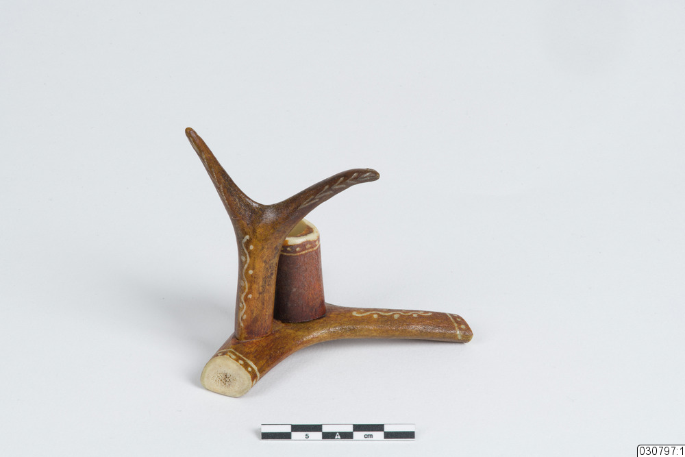 - Ett knivställ i horn. Knivstället står på tre ben som en slangbella. Sedan har det två utstickande delar, en bit som även den ser ut som en slangbella. Den delen är dekorerad med ett graverat mönster. Sedan är den andra delen urholkat för att kunna ställa knivarna i. På den delen finns det graverat ett mönster som föreställer en blomma.