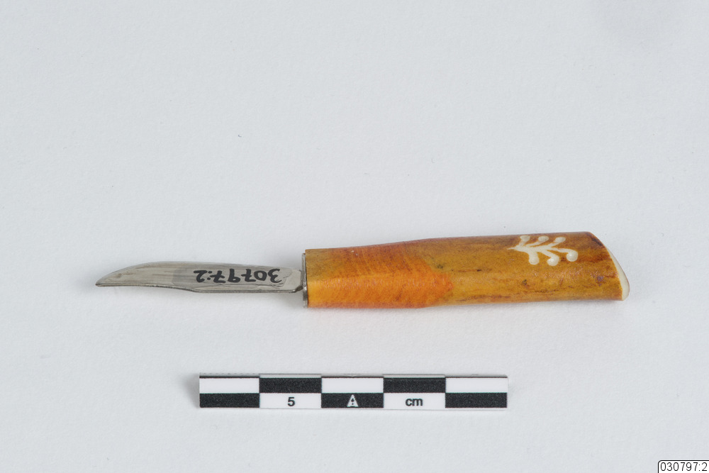 - En liten kniv tillhörande ett knivställ i horn. Skaftet är av horn och på vardera sida av skaftet finns det en gravering i hornet. Bladet är troligtvis gjort i stål med lite slitage.