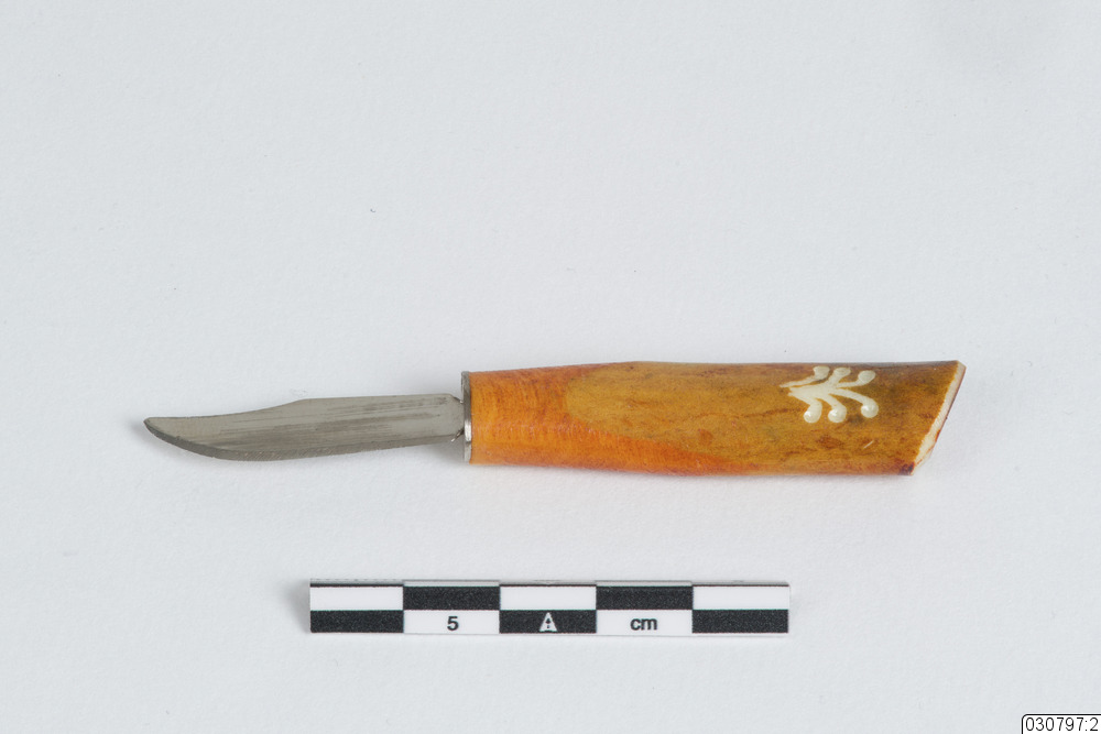 En liten kniv tillhörande ett knivställ i horn. Skaftet är av horn och på vardera sida av skaftet finns det en gravering i hornet. Bladet är troligtvis gjort i stål med lite slitage.