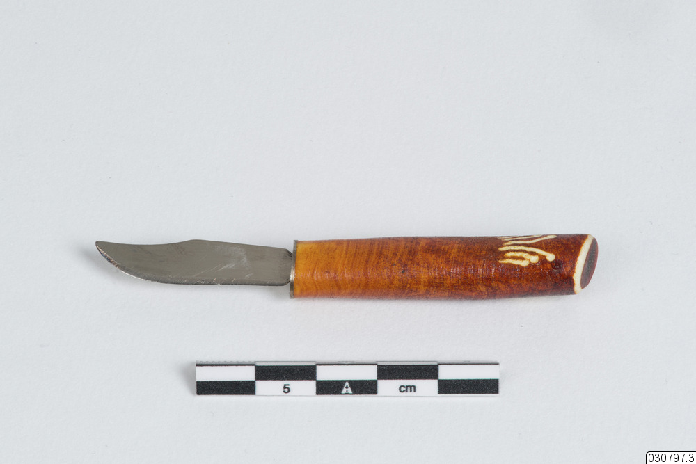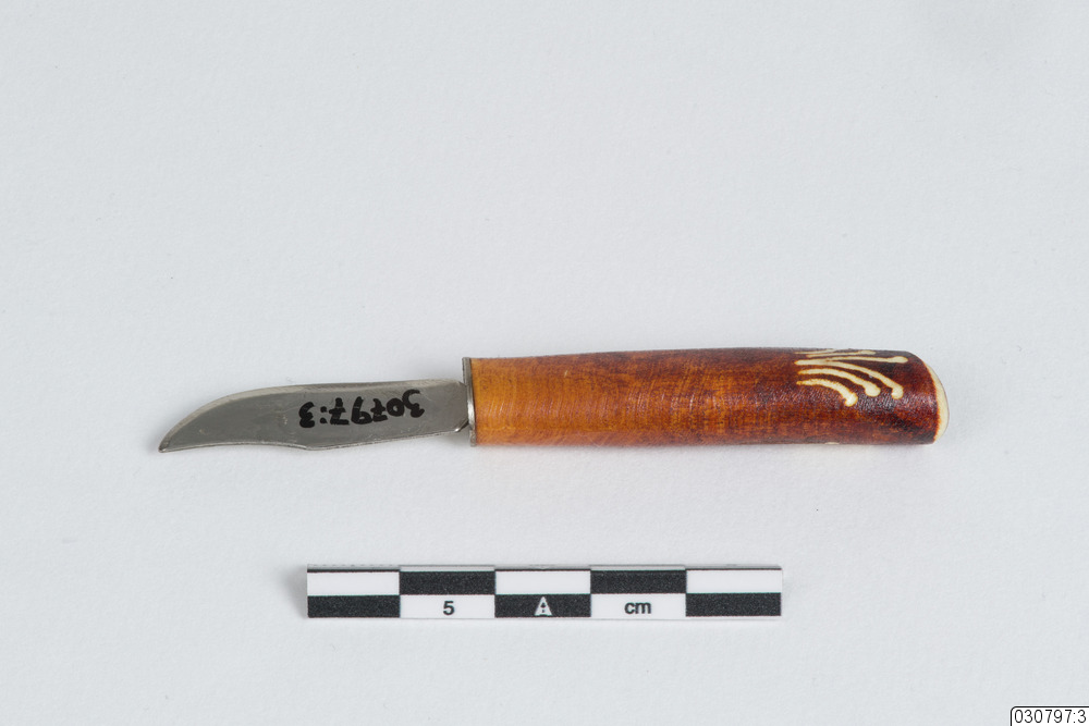 En liten kniv tillhörande ett knivställ i horn. Skaftet är av horn och på vardera sida av skaftet finns det en gravering i hornet. Bladet är troligtvis gjort i stål med lite slitage.