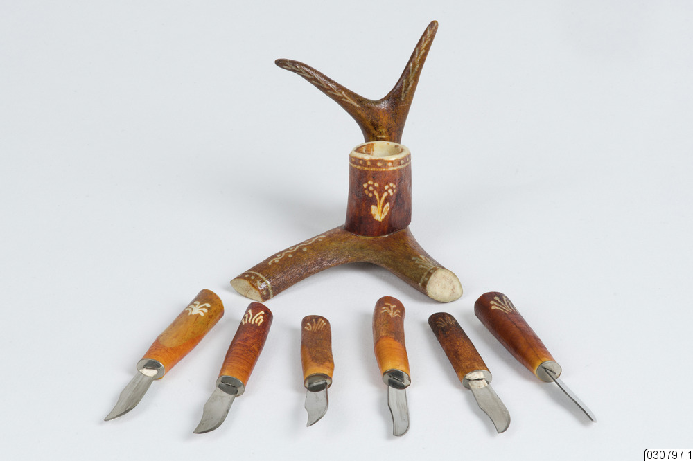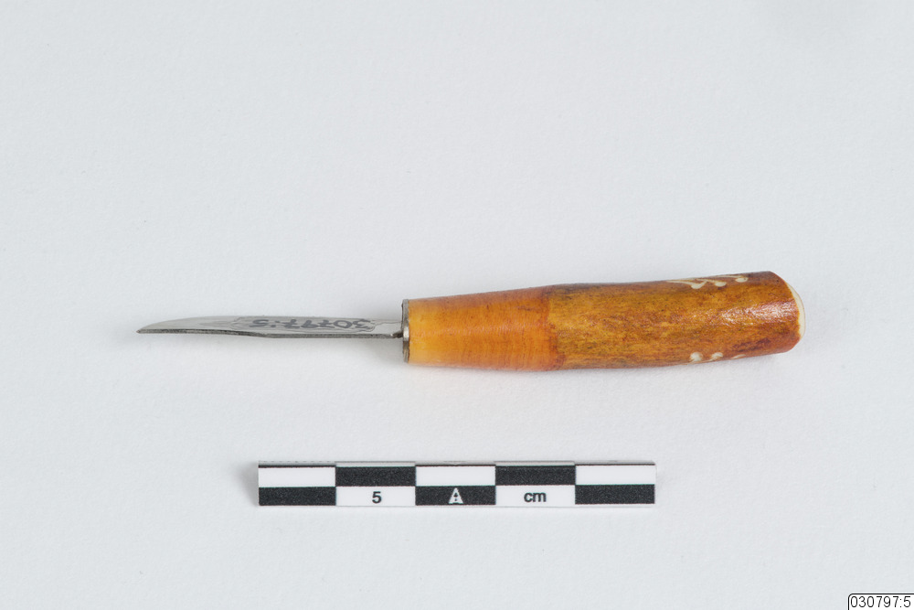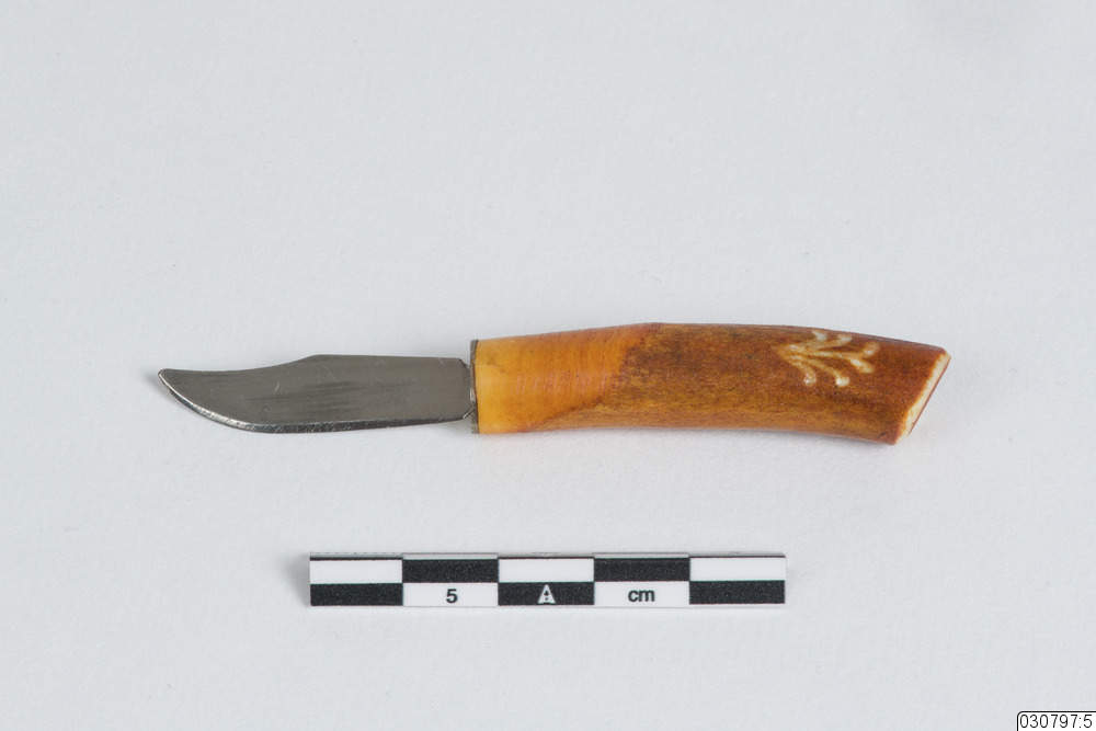 - En liten kniv tillhörande ett knivställ i horn. Skaftet är av horn och på vardera sida av skaftet finns det en gravering i hornet. Bladet är troligtvis gjort i stål med lite slitage.