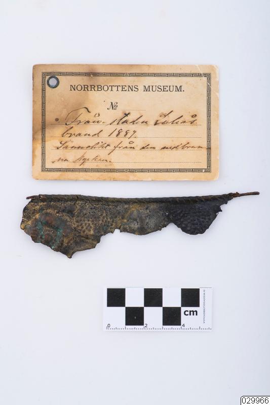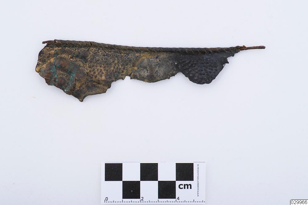 Långsmalt metallfragment (mässing). Stansad dekor. Brandskadat.