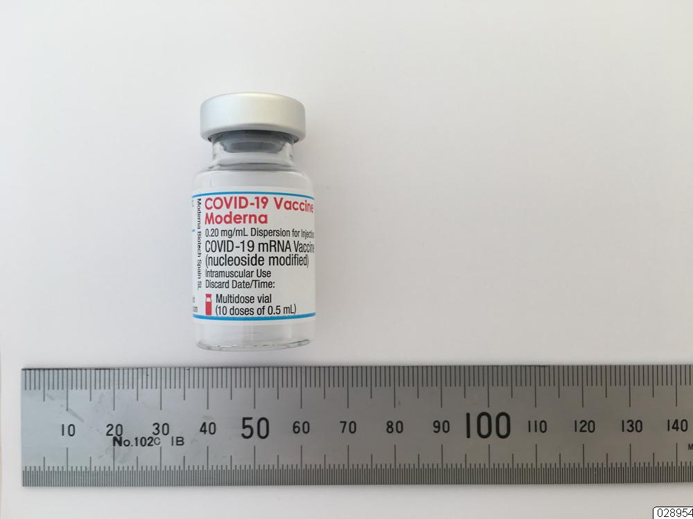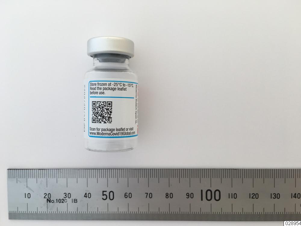 - Behållare för Covid-19 Vaccine Moderna. Transparent ampull i glas med aluminiumförsegling och gummimembran i grått. Vit etikett med röd och svart text och blå linjer.