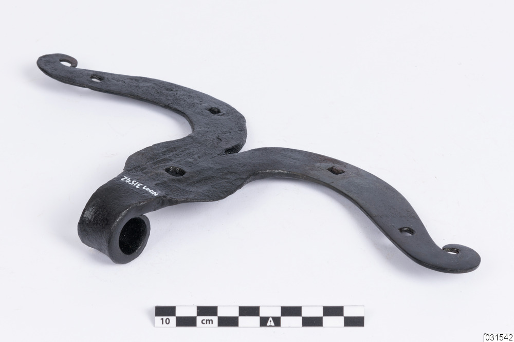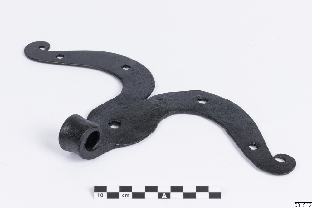 Ett gångjärn format som ett bockhorn. Det finns fem hål för spikar.