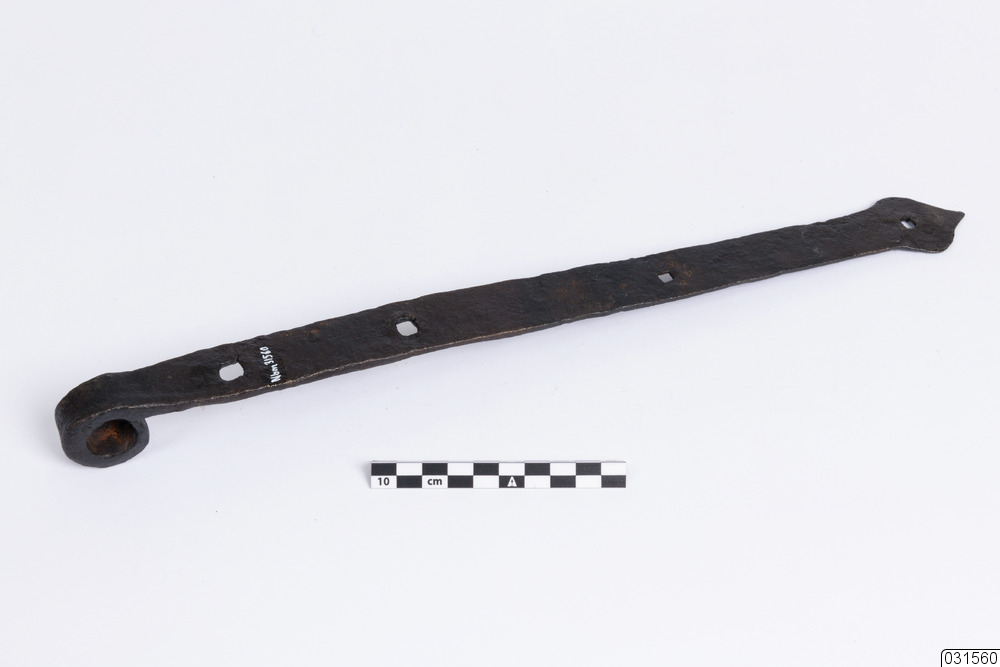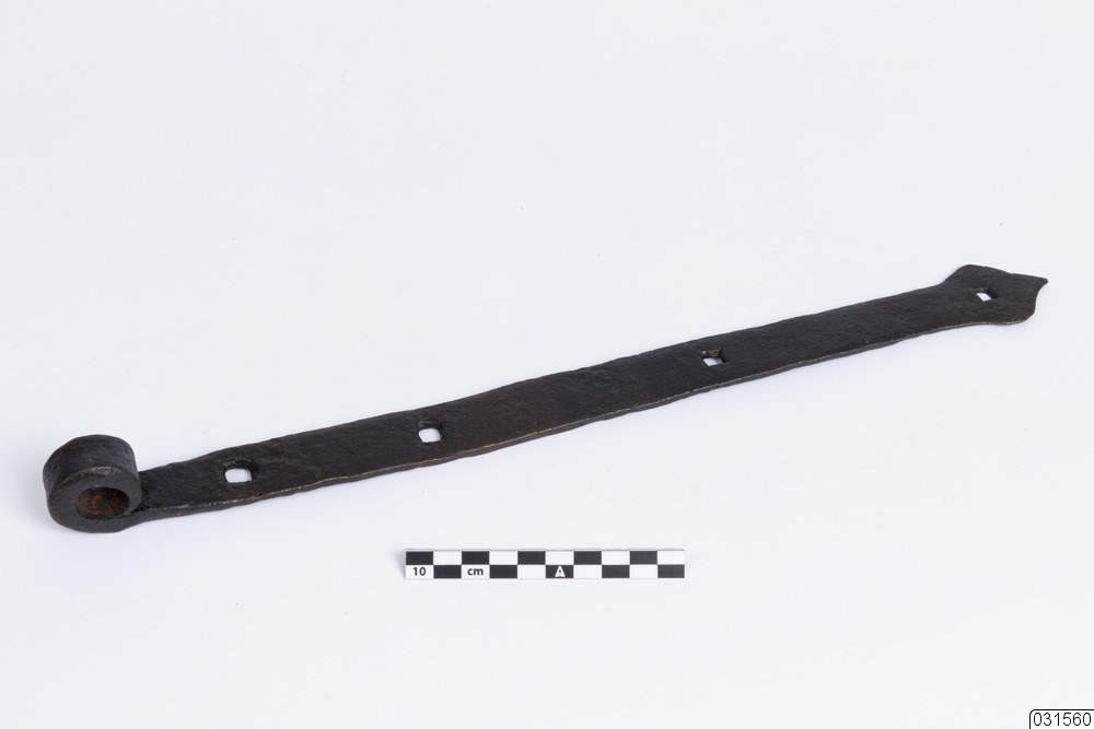 Ett långsmalt gångjärn. Det finns fyra hål för spikar.