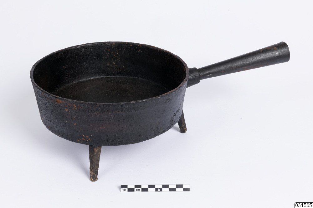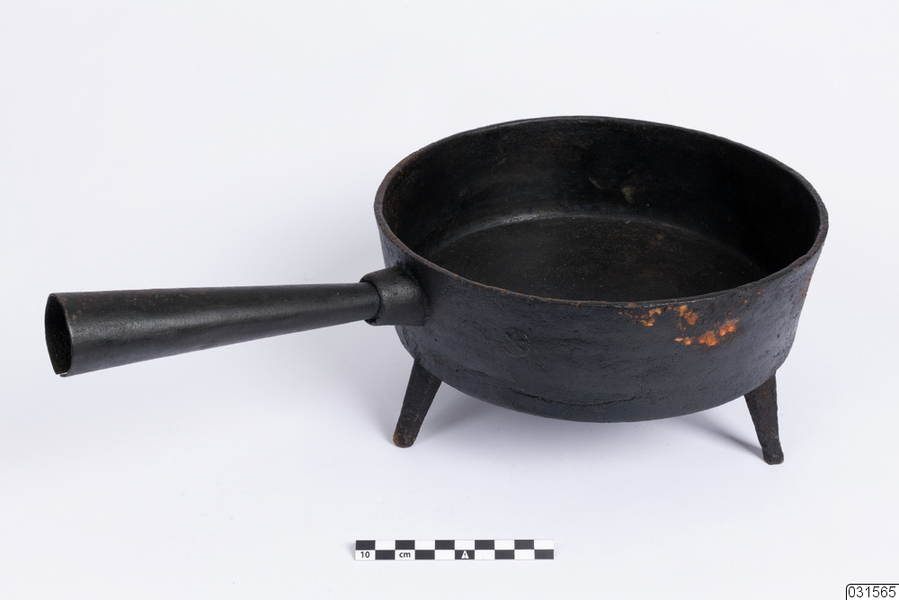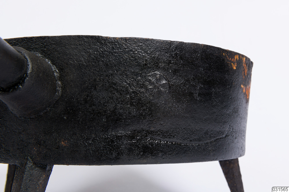 En stor gryta med ett cylinderformat handtag. Grytan har stämplar från Rosfors bruk.