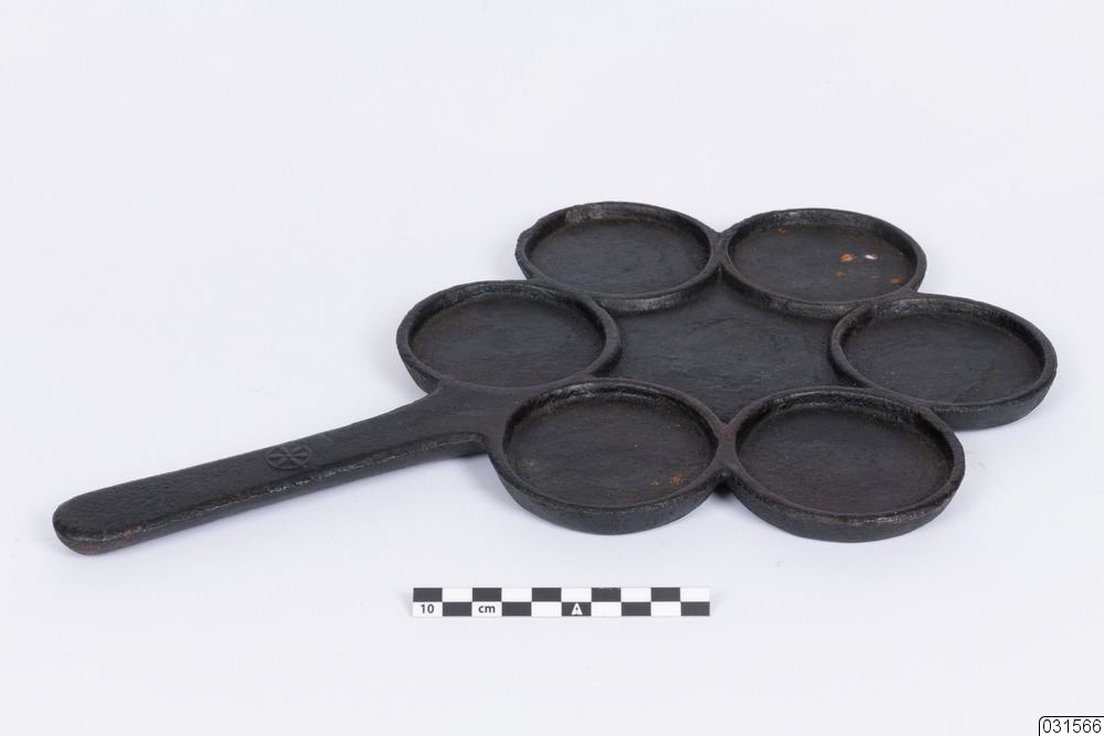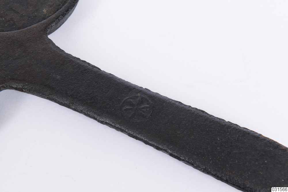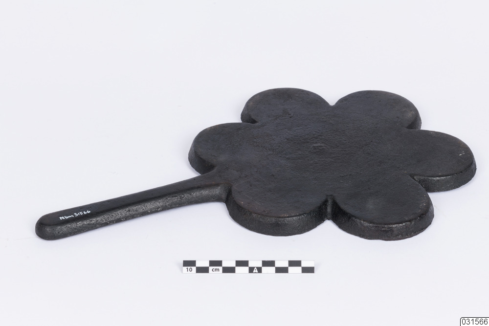 Ett plättlagg med plats för sex plättar samtidigt. Järnet har en stämpel från Rosfors bruk.