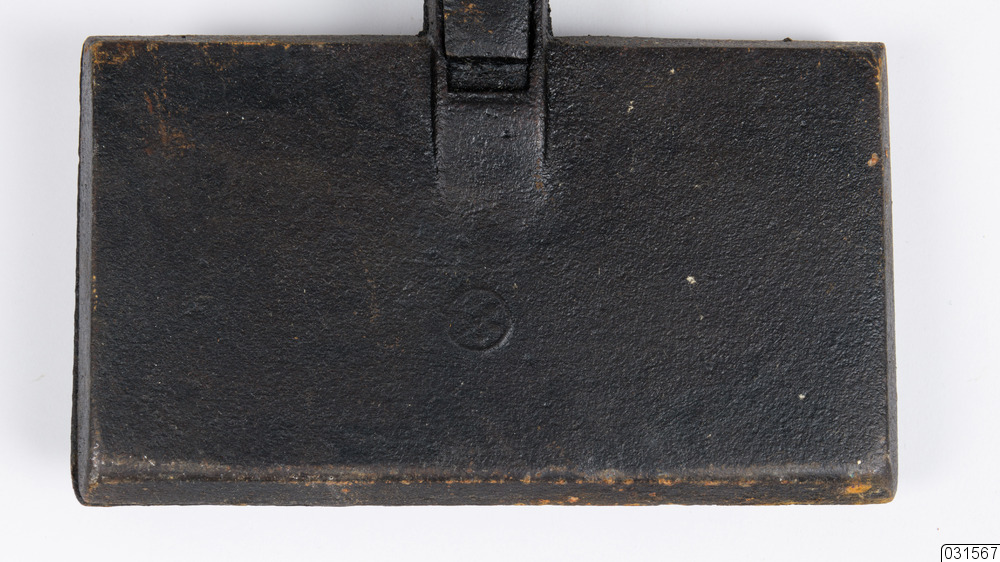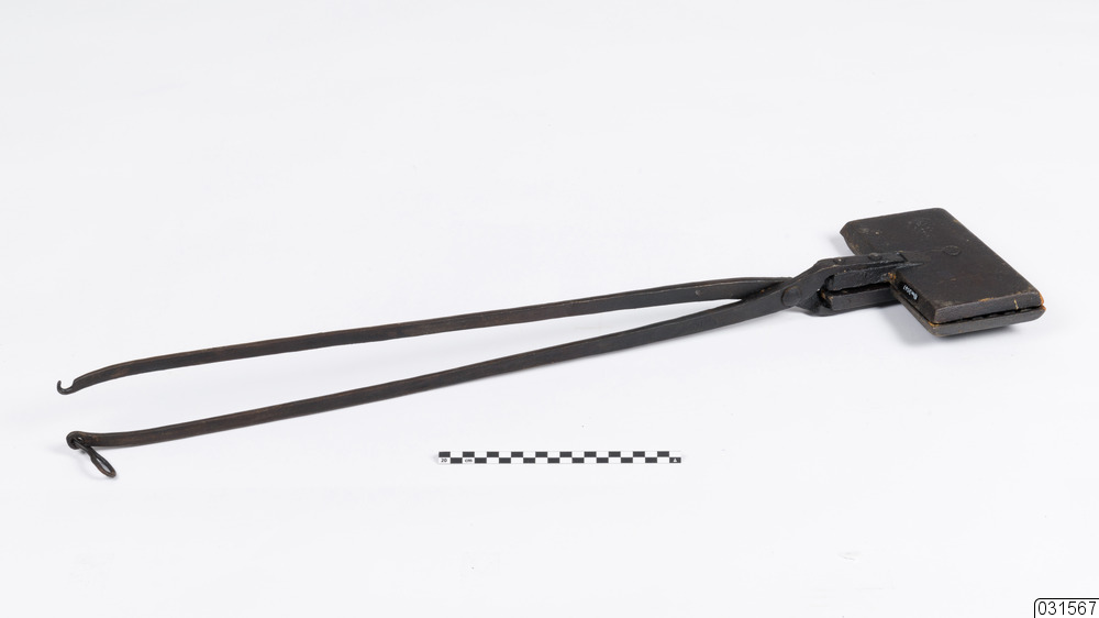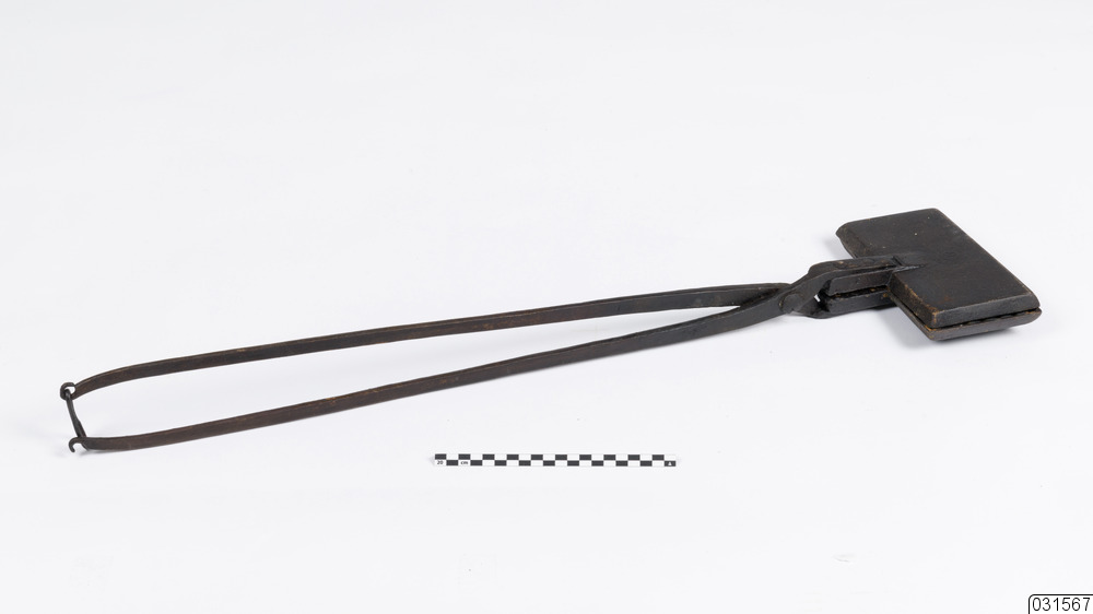 Ett våffeljärn med långa handtag. Järnet har en stämpel från Rosfors bruk.