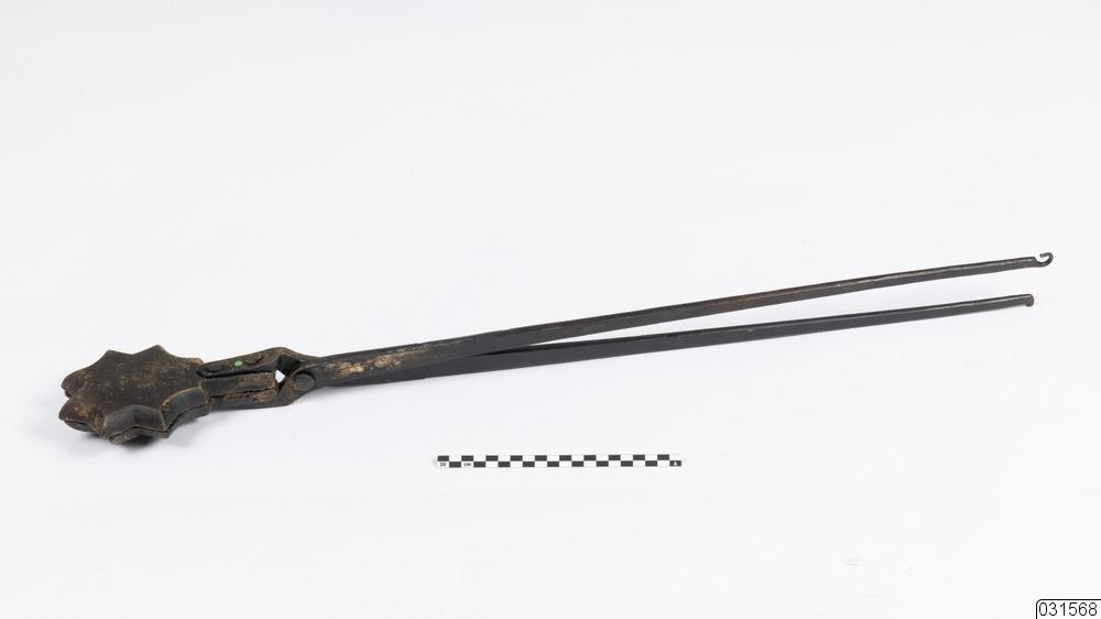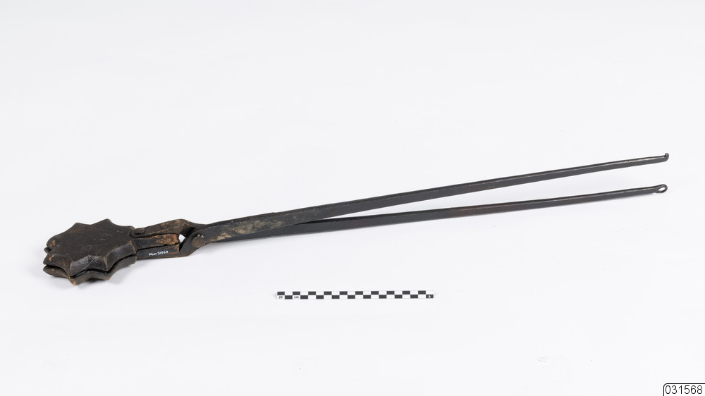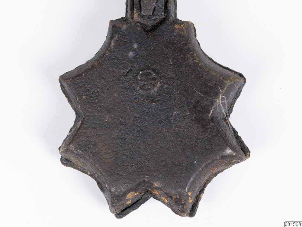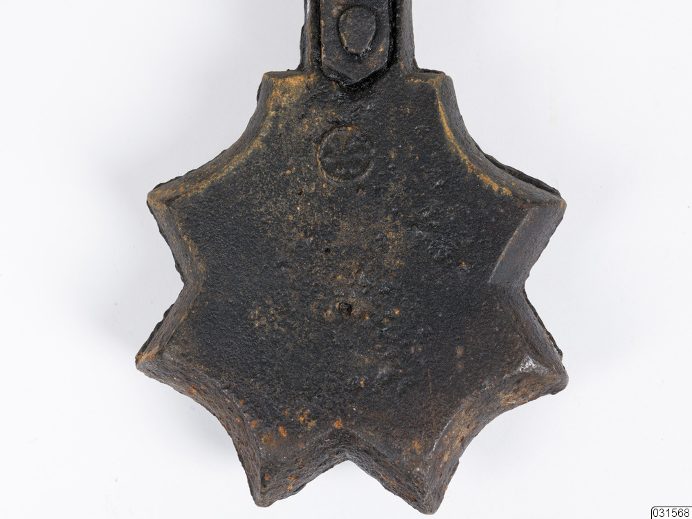 Ett stjärnformat våffeljärn med långa handtag. Järnet har en stämpel från Rosfors bruk.