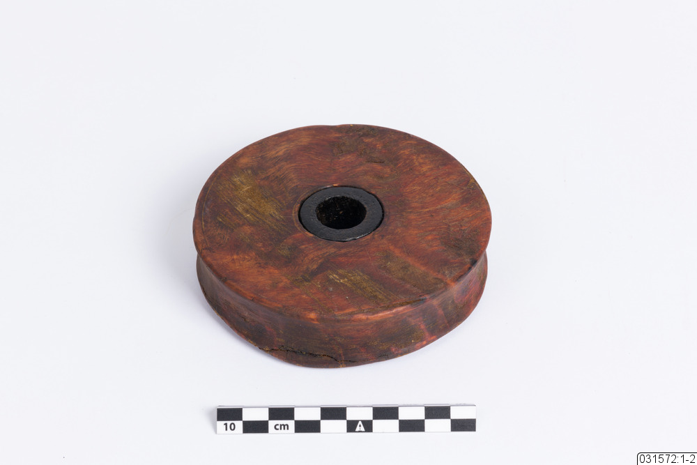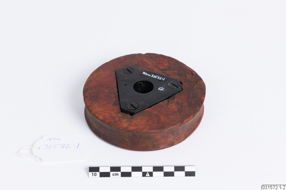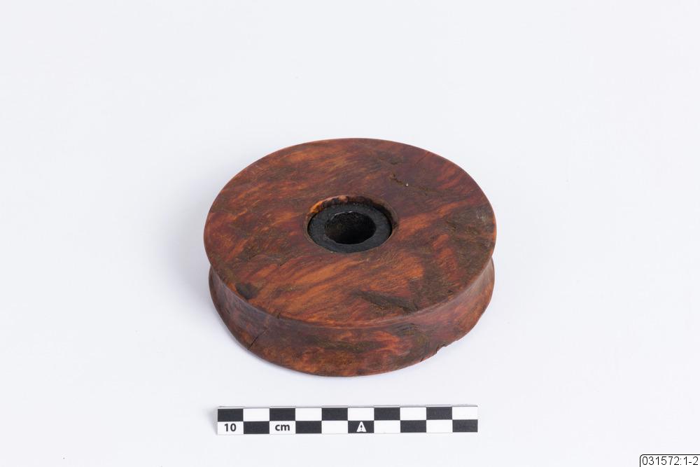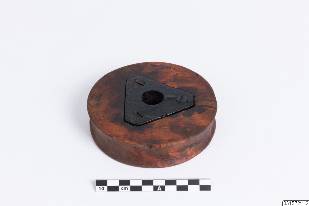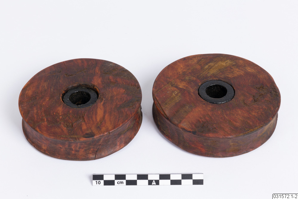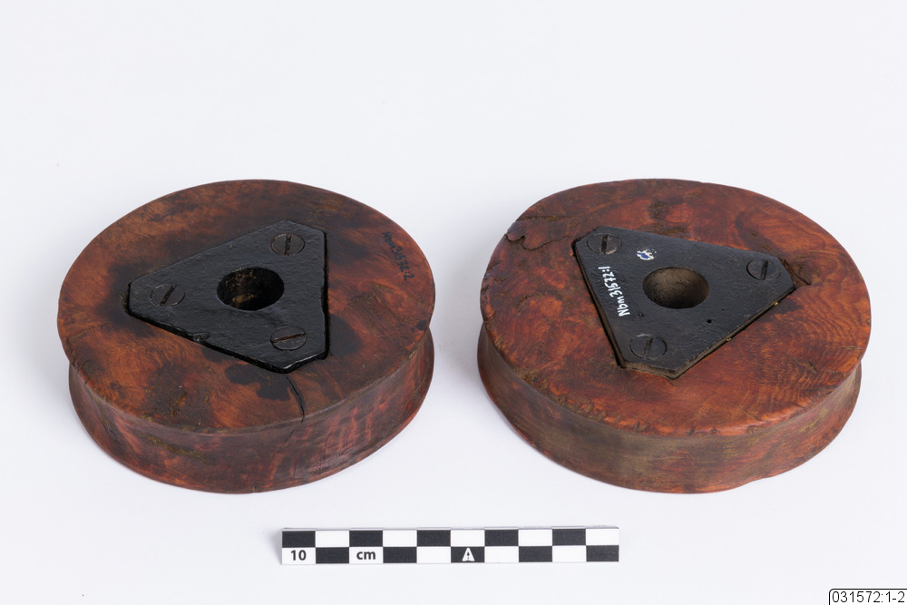 Två blockhjul med en smidd mitt. Själva hjulet är av träd. Tre skruvar sitter i vardera hjul.