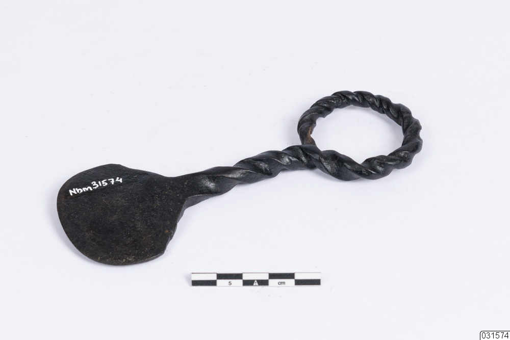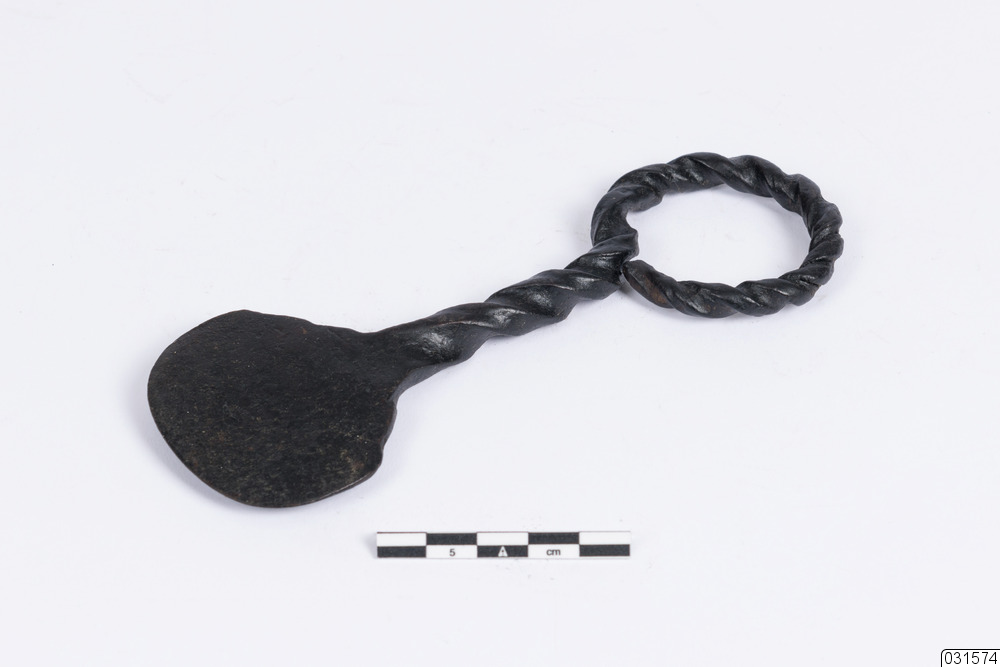 En liten grytskrapa med ett utsmyckat handtag.