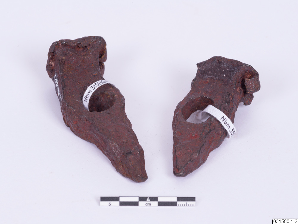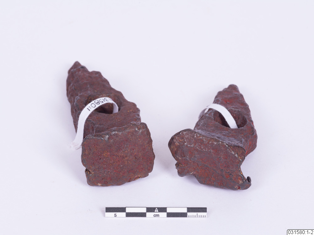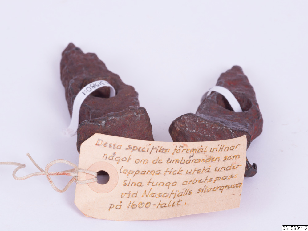 Ett par med malmhammare som är fästa tillsammans med svart tejp. Malmhammarna är ganska skadade. En lapp är fäst på hammarna med text skriven av Bengt Johansson. Där skriver han om hur dessa hammare vittnar om de hemska arbetsförhållanden som den samiska befolkningen fick utstå i silvergruvor på 1600-talet.