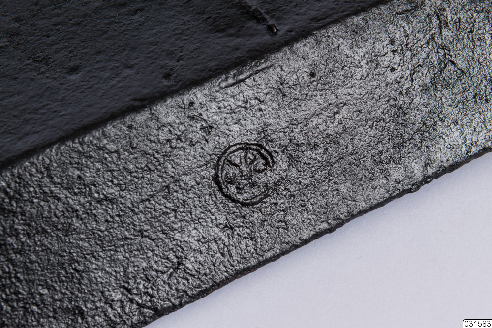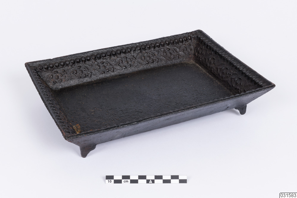 Ett rektangulärt askfat med fyra små ben. Insidan är utsmyckad. Det finns också en järnstämpel från Rosfors bruk på askfatet.